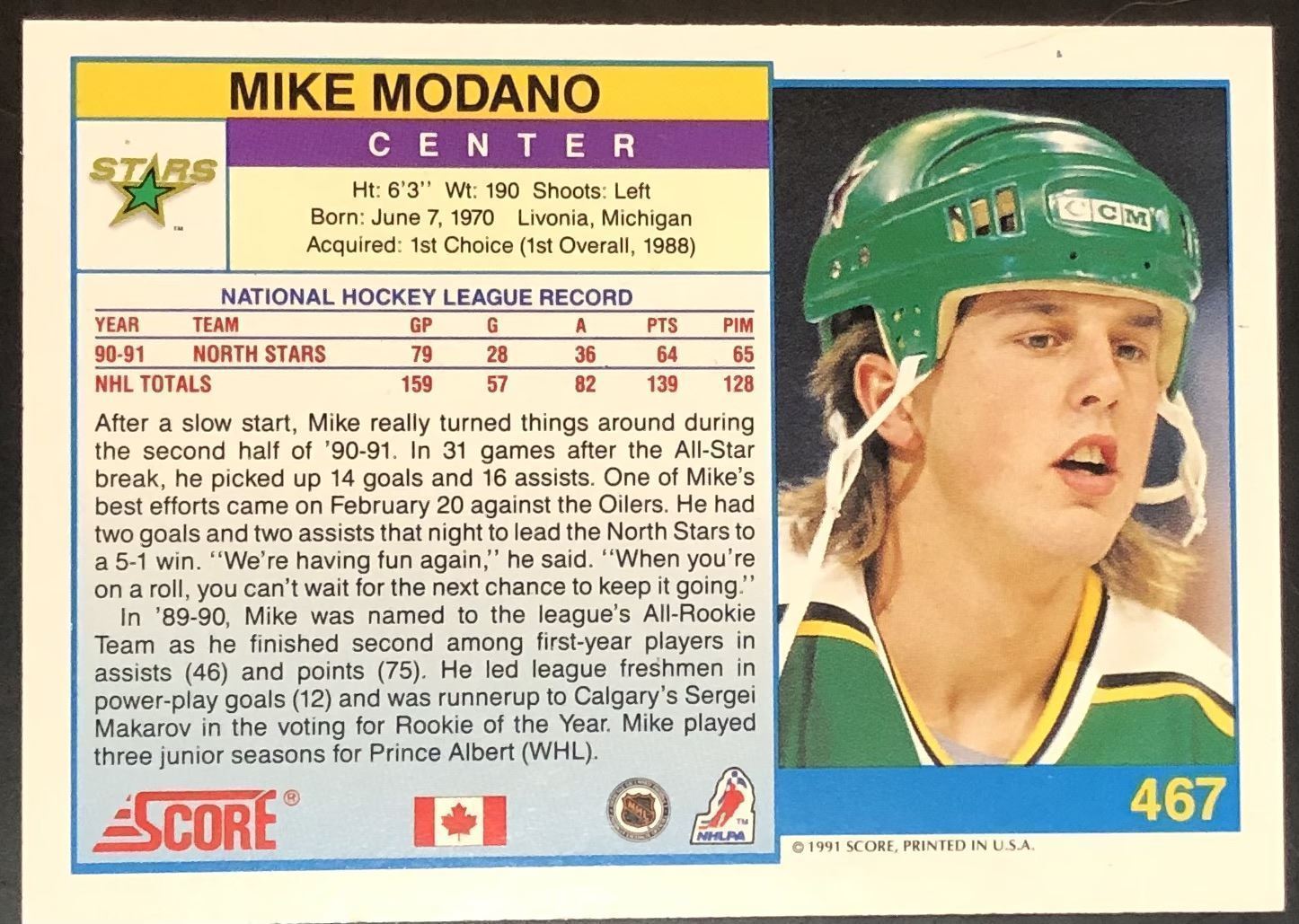 Lot 988 1991-92 SCORE HOCKEY MIKE MODANO (HOF)