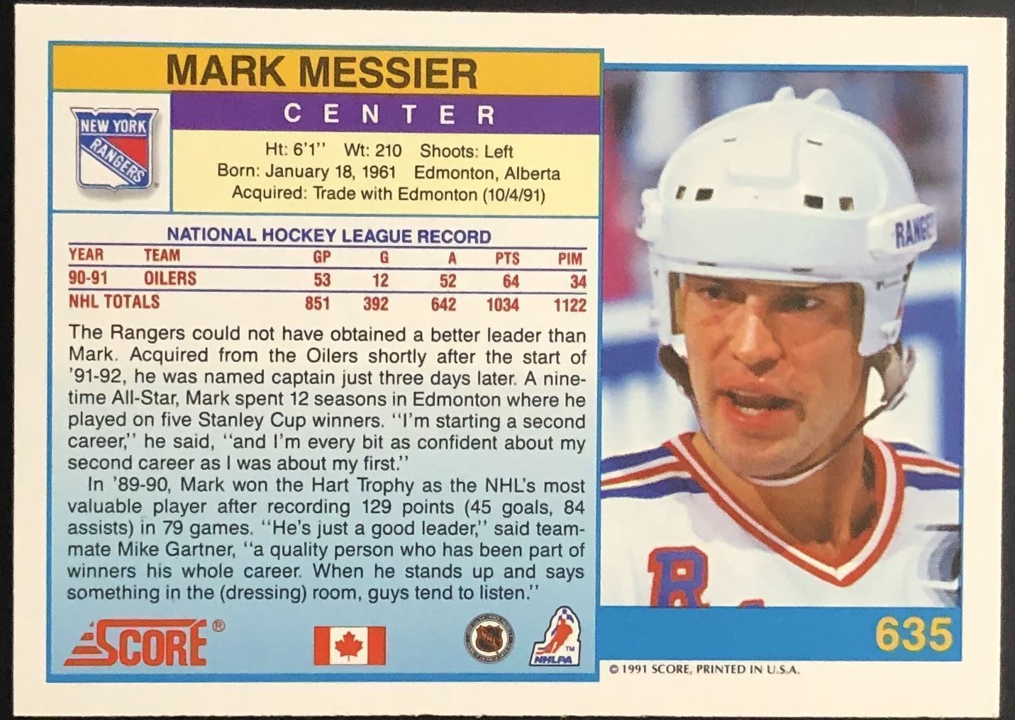 Lot 994 1991-92 SCORE MARK MESSIER (HOF)
