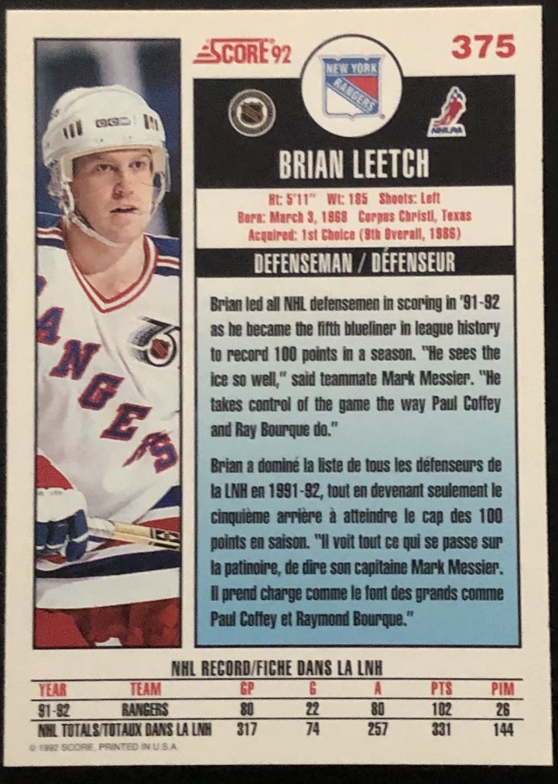 Lot 1037 1992-93 SCORE BRIAN LEETCH (HOF)