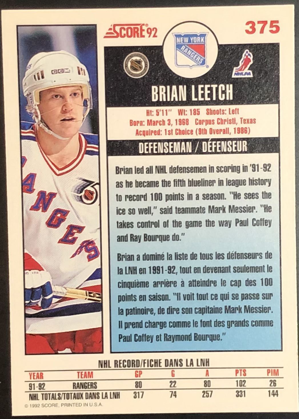 Lot 1042 1992-93 SCORE NHL BRIAN LEETCH (HOF)