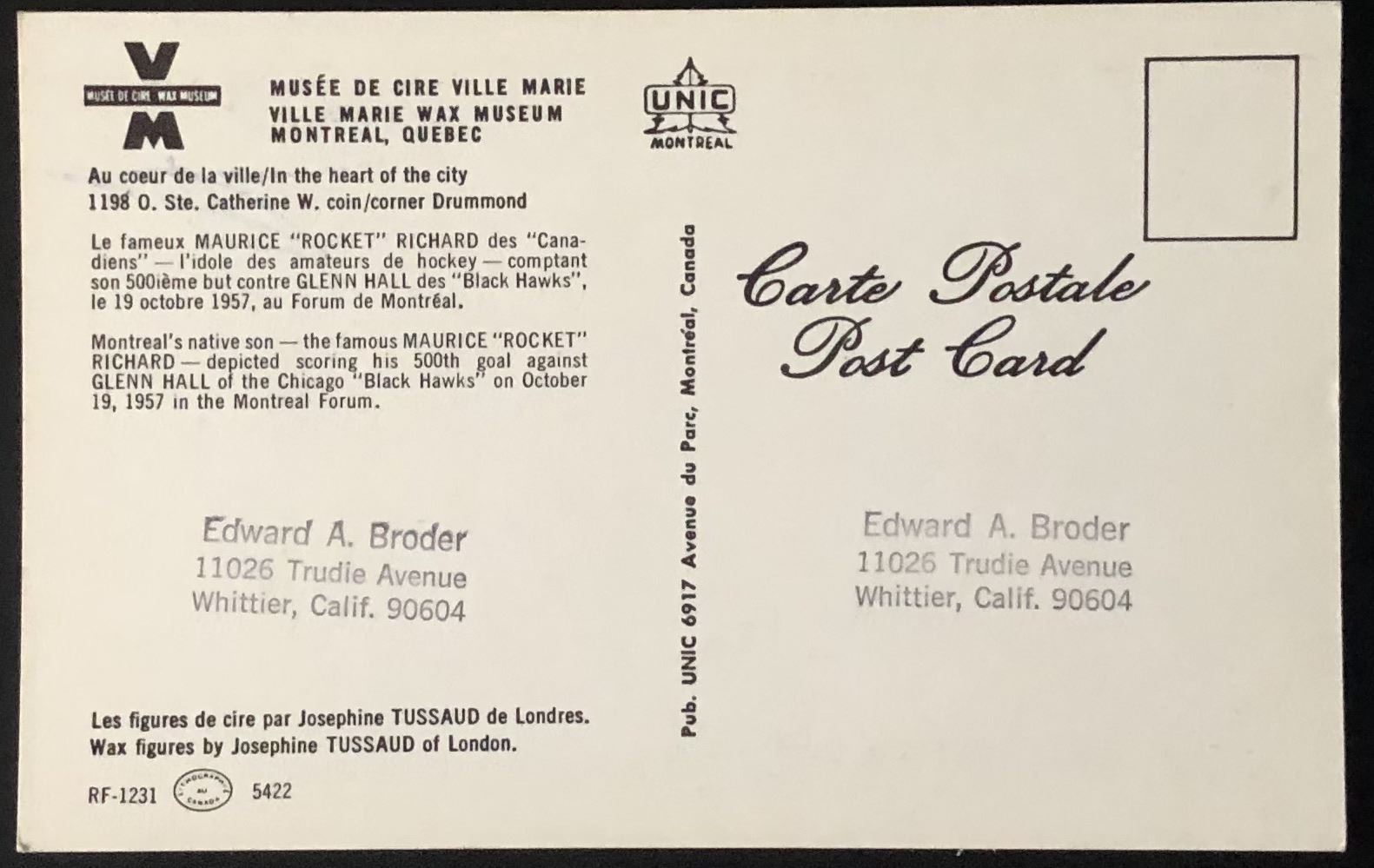 Lot 1146 1950's MAURICE ' ROCKET' RICHARD / GLENN HALL (HOF) WAX MUSEUM POSTCARD