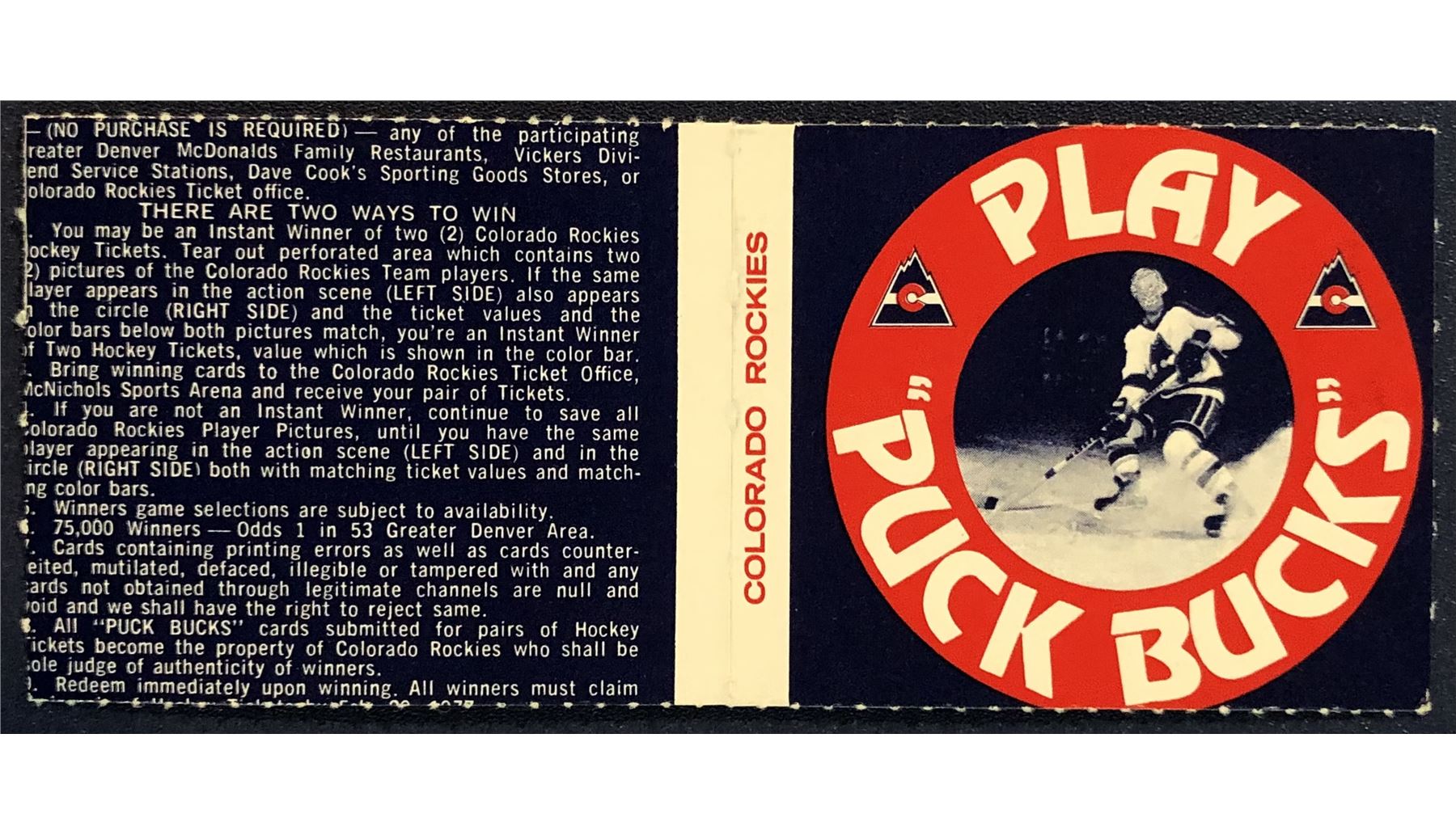 Lot 1159 1976-77 COLORADO ROCKIES NHL PUCK BUCKS GAME CARD - ANDRUFF / LEFLEY
