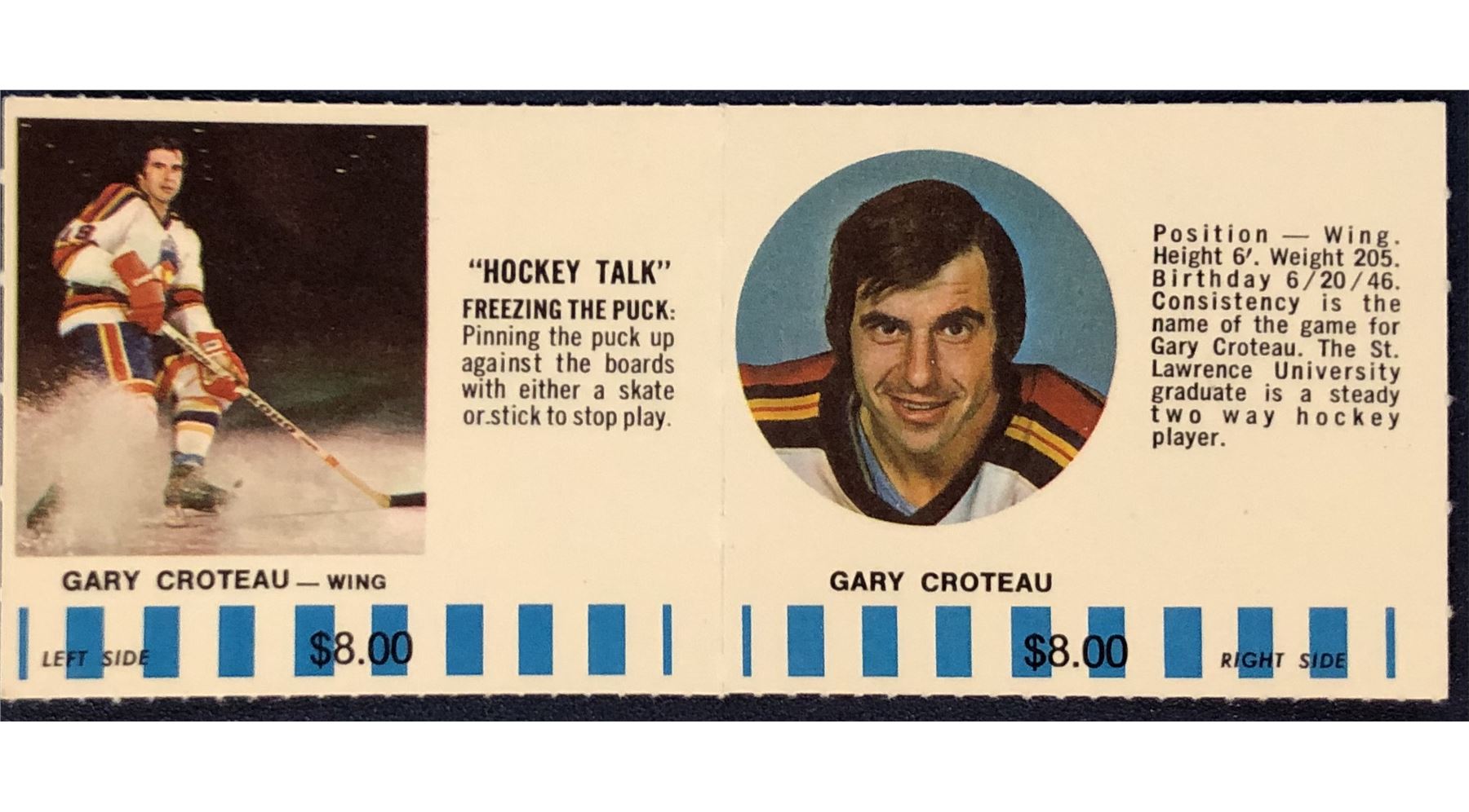 1976-77 COLORADO ROCKIES NHL PUCK BUCKS GAME CARD - GARY CROTEAU