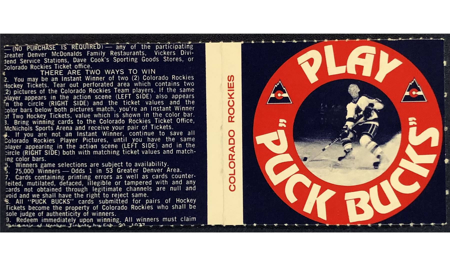 Lot 1163 1976-77 COLORADO ROCKIES NHL PUCK BUCKS GAME CARD - GARY CROTEAU