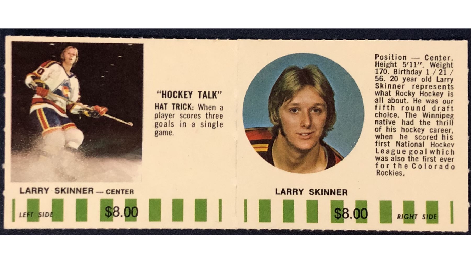 1976-77 COLORADO ROCKIES NHL PUCK BUCKS GAME CARD - LARRY SKINNER