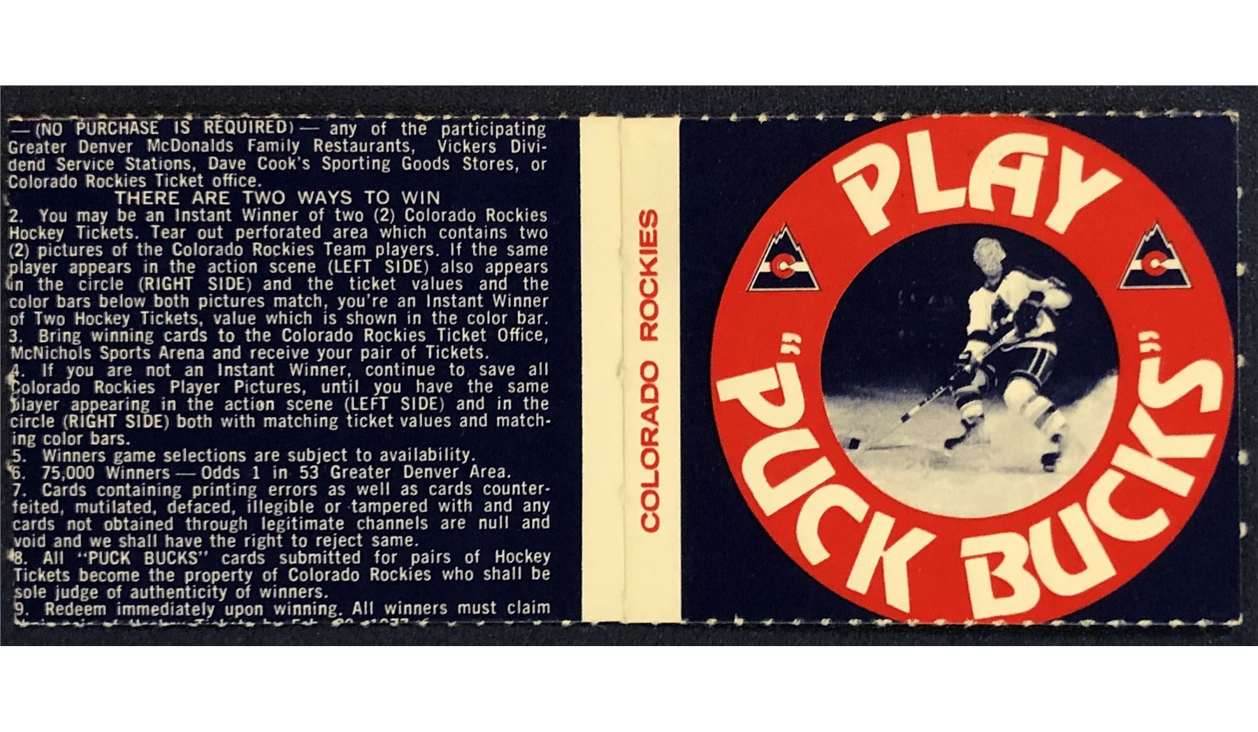 Lot 1166 1976-77 COLORADO ROCKIES NHL PUCK BUCKS GAME CARD - LARRY SKINNER