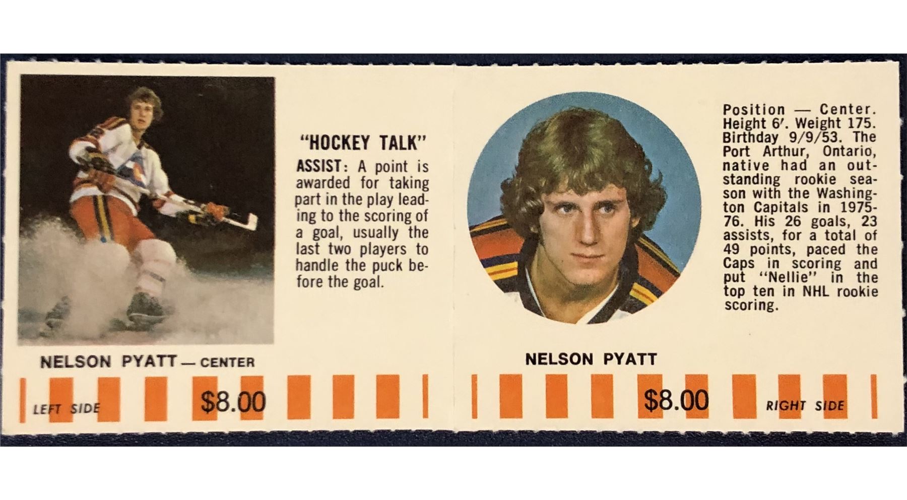 1976-77 COLORADO ROCKIES NHL PUCK BUCKS GAME CARD - NELSON PYATT