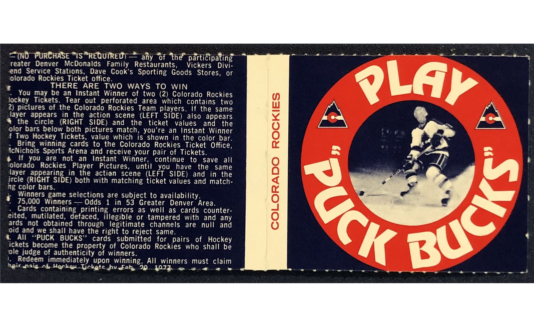 Lot 1168 1976-77 COLORADO ROCKIES NHL PUCK BUCKS GAME CARD - NELSON PYATT