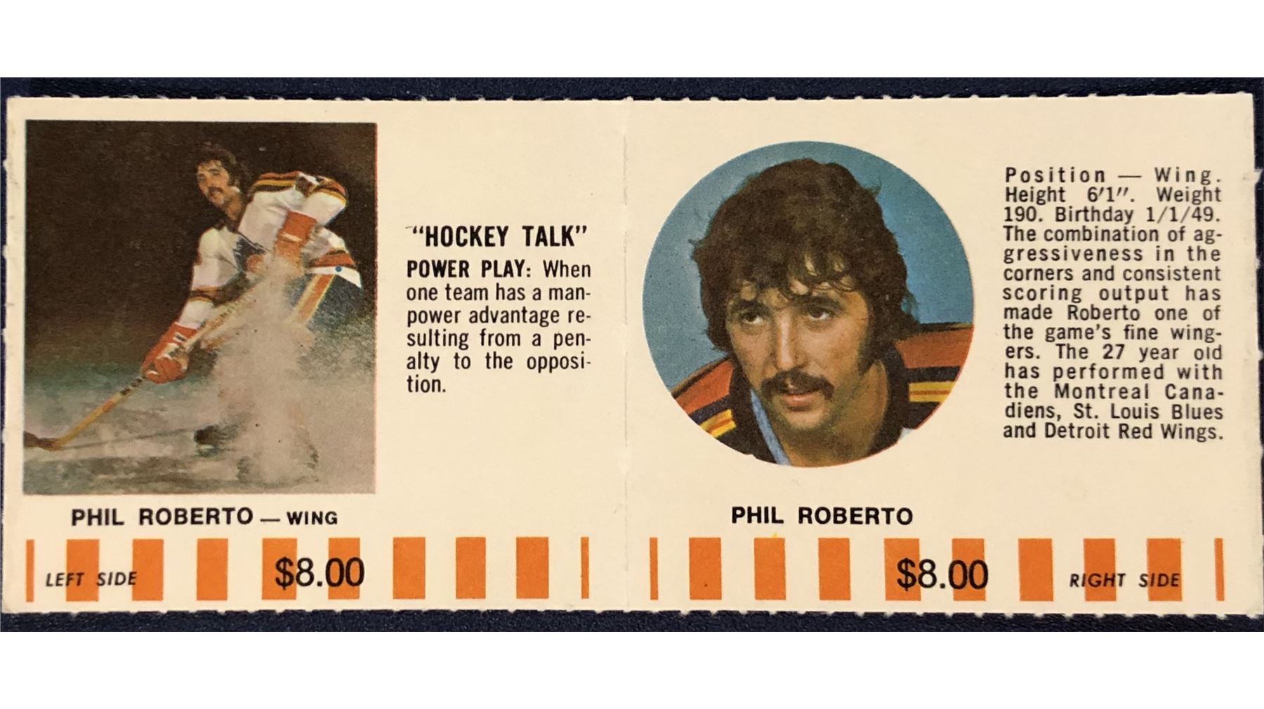 1976-77 COLORADO ROCKIES NHL PUCK BUCKS GAME CARD - PHIL ROBERTO