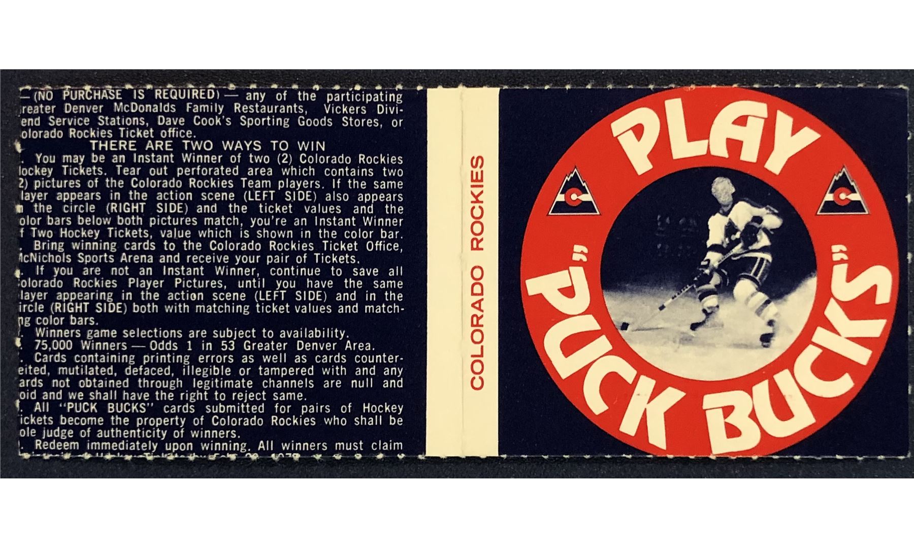Lot 1169 1976-77 COLORADO ROCKIES NHL PUCK BUCKS GAME CARD - PHIL ROBERTO