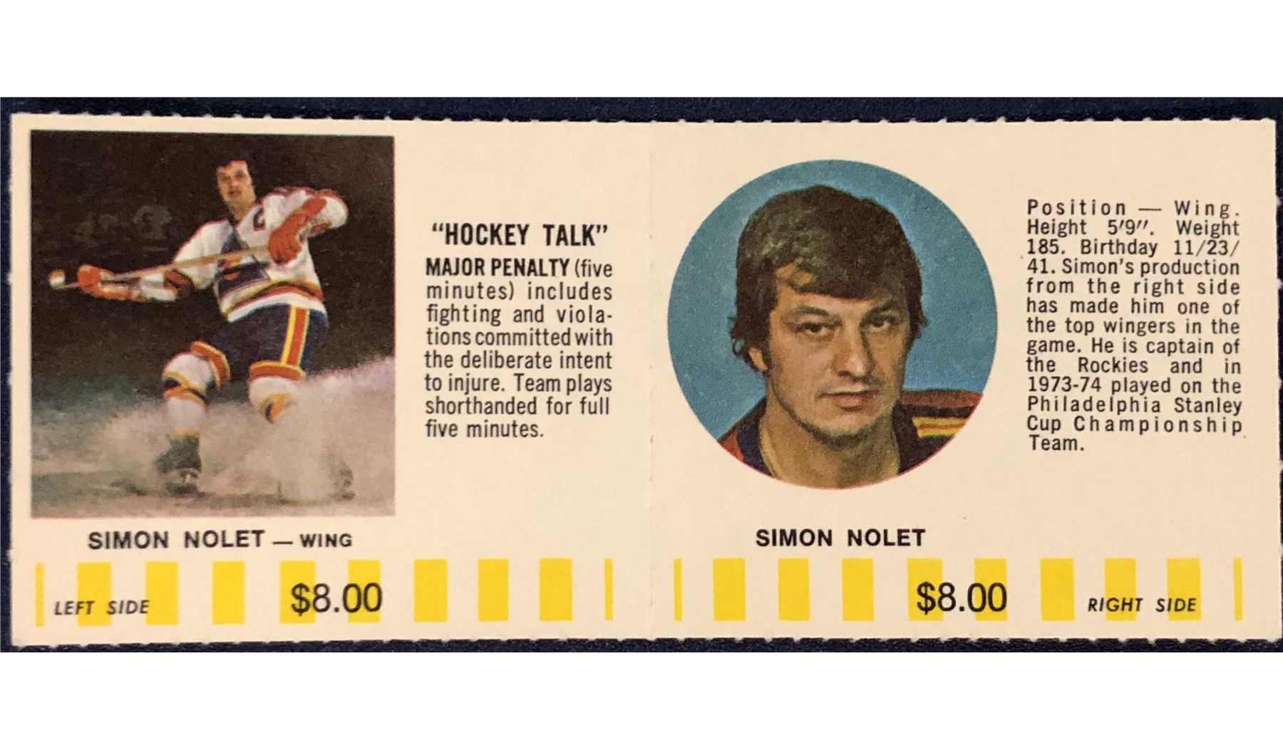 1976-77 COLORADO ROCKIES NHL PUCK BUCKS GAME CARD - SIMON NOLET