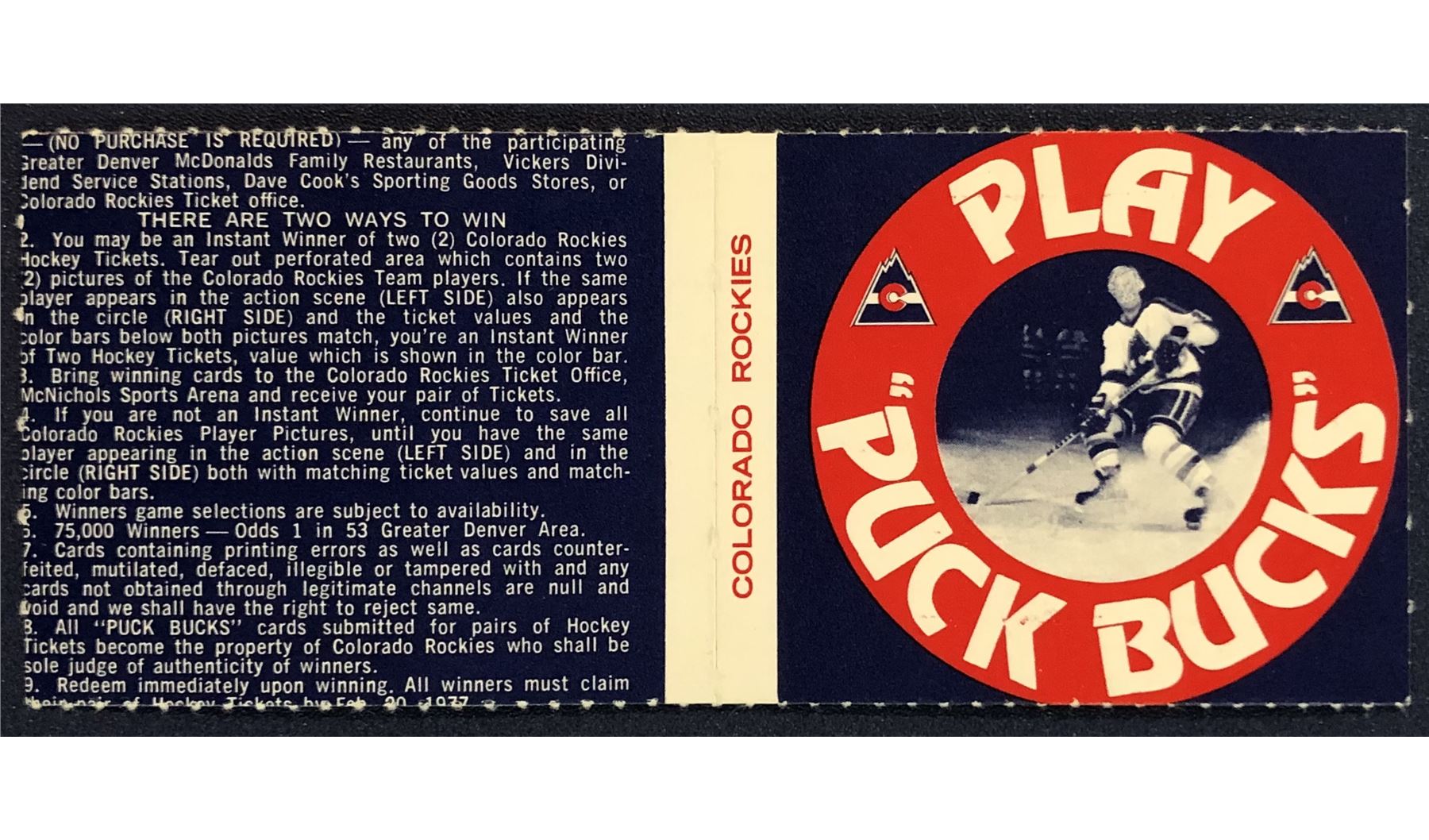 Lot 1172 1976-77 COLORADO ROCKIES NHL PUCK BUCKS GAME CARD - SIMON NOLET