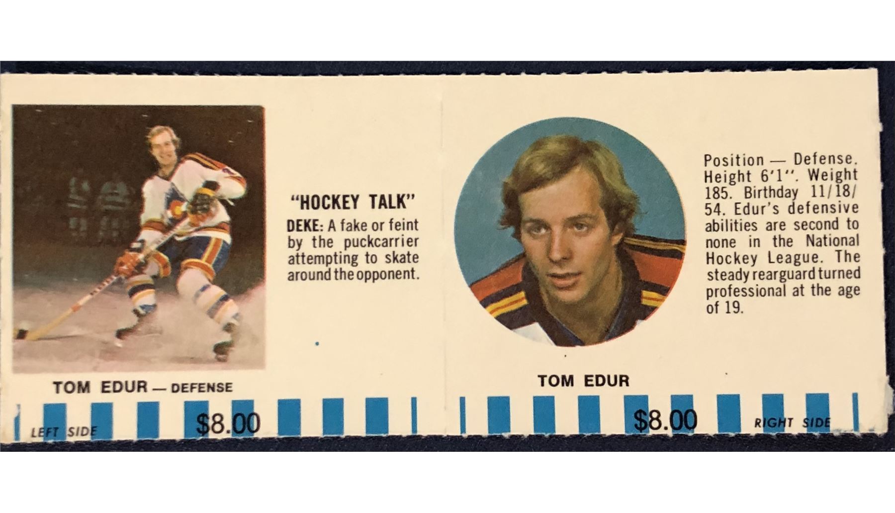 1976-77 COLORADO ROCKIES NHL PUCK BUCKS GAME CARD - TOM EDUR