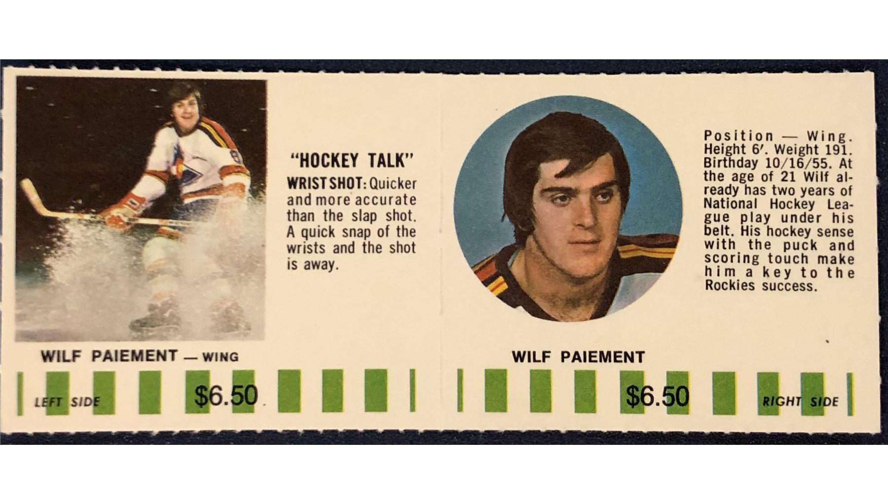 1976-77 COLORADO ROCKIES NHL PUCK BUCKS GAME CARD - WILF PAIEMENT