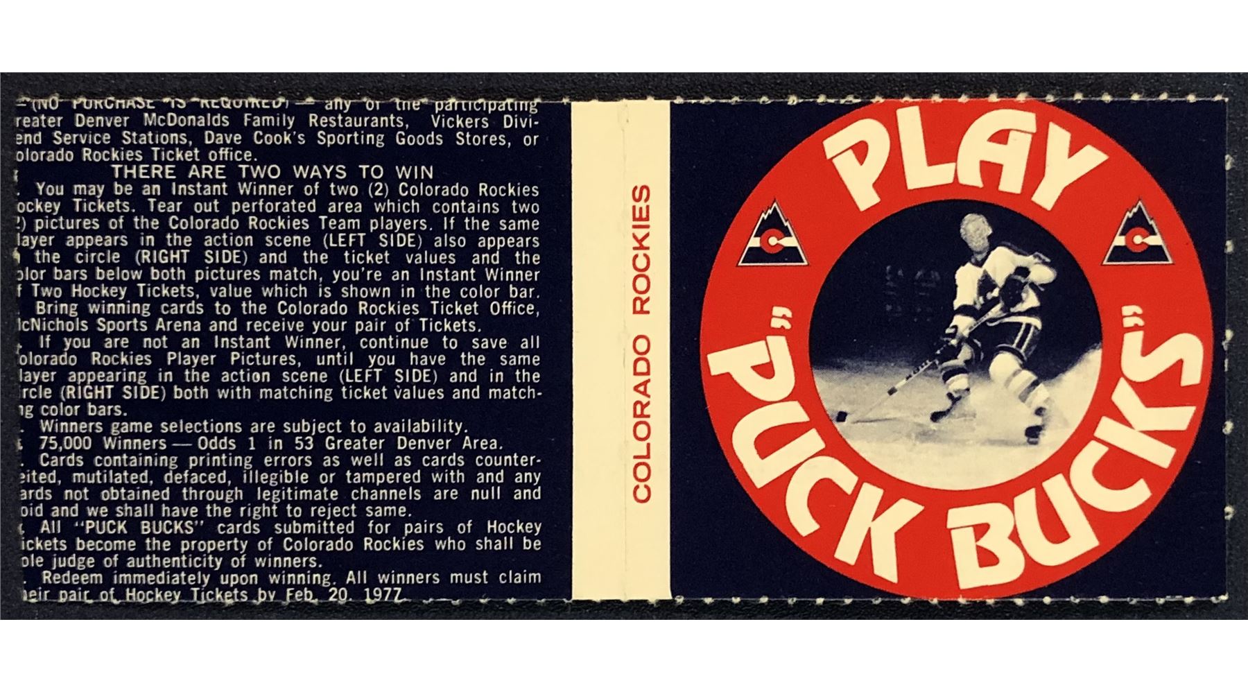 Lot 1176 1976-77 COLORADO ROCKIES NHL PUCK BUCKS GAME CARD - WILF PAIEMENT