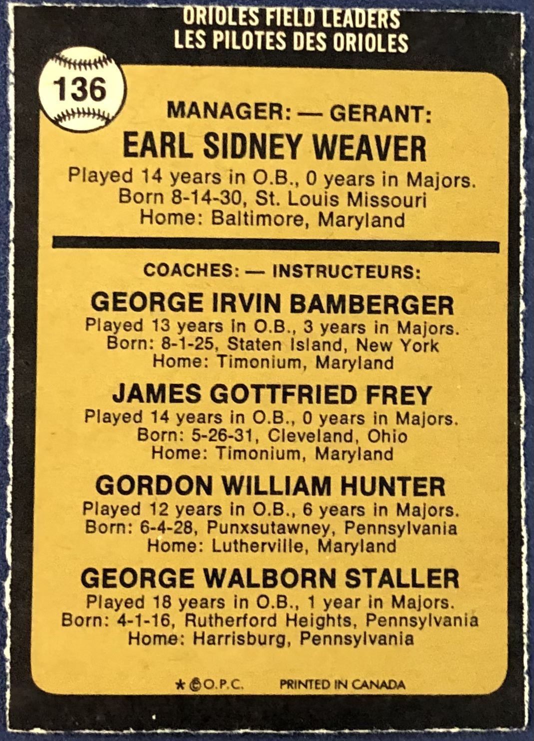 Lot 1231 1973 O-PEE-CHEE EARL WEAVER (HOF)