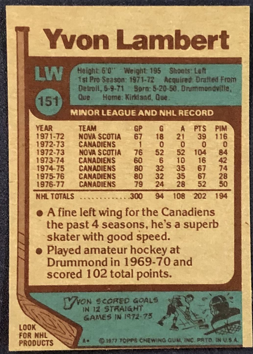 Lot 1296 1977-78 TOPPS YVON LAMBERT