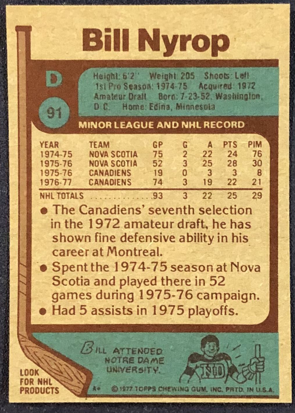 Lot 1309 1977-78 TOPPS BILL NYROP ROOKIE CARD