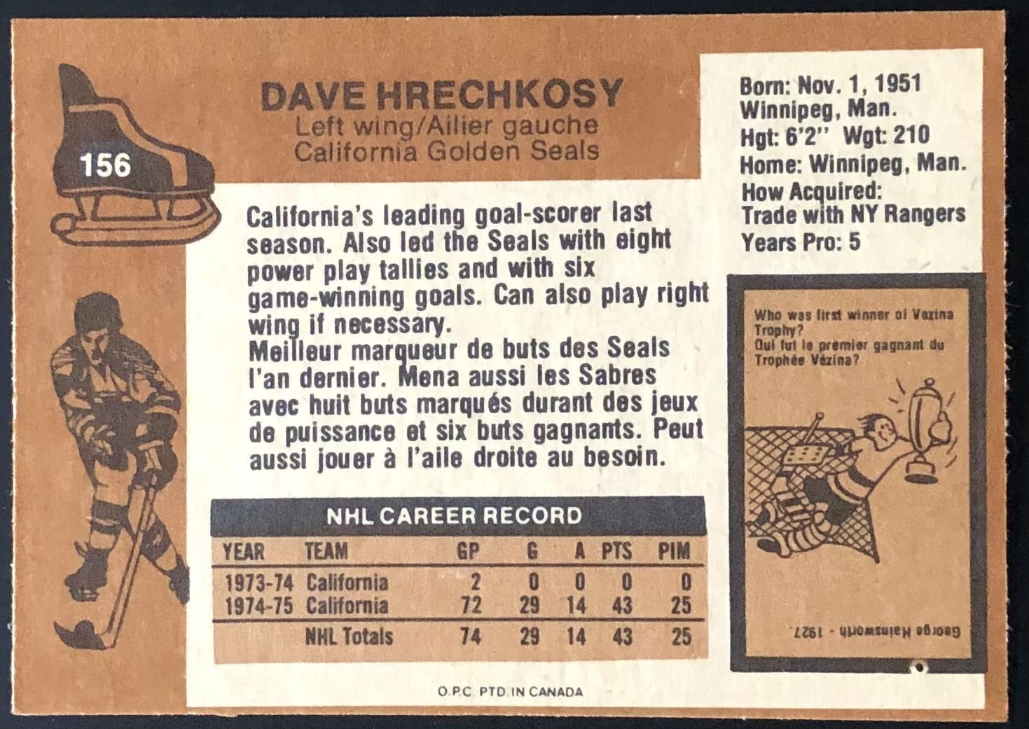 Lot 1324 1975-76 O-PEE-CHEE DAVE HRECHKOSY ROOKIE CARD