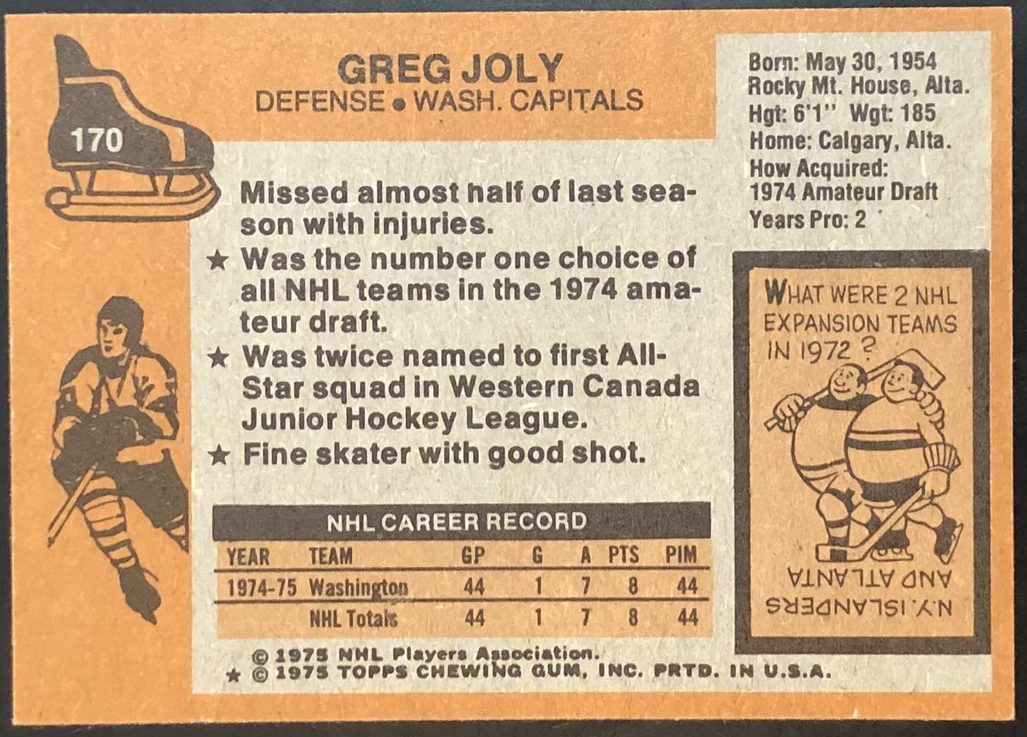Lot 1329 1975-76 NHL TOPPS GREG JOLY ROOKIE CARD
