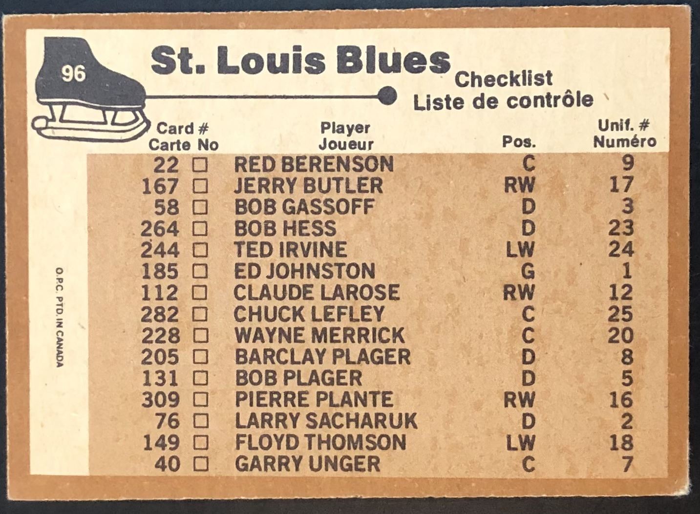 Lot 1331 1975-76 NHL O-PEE-CHEE ST. LOUIS BLUES