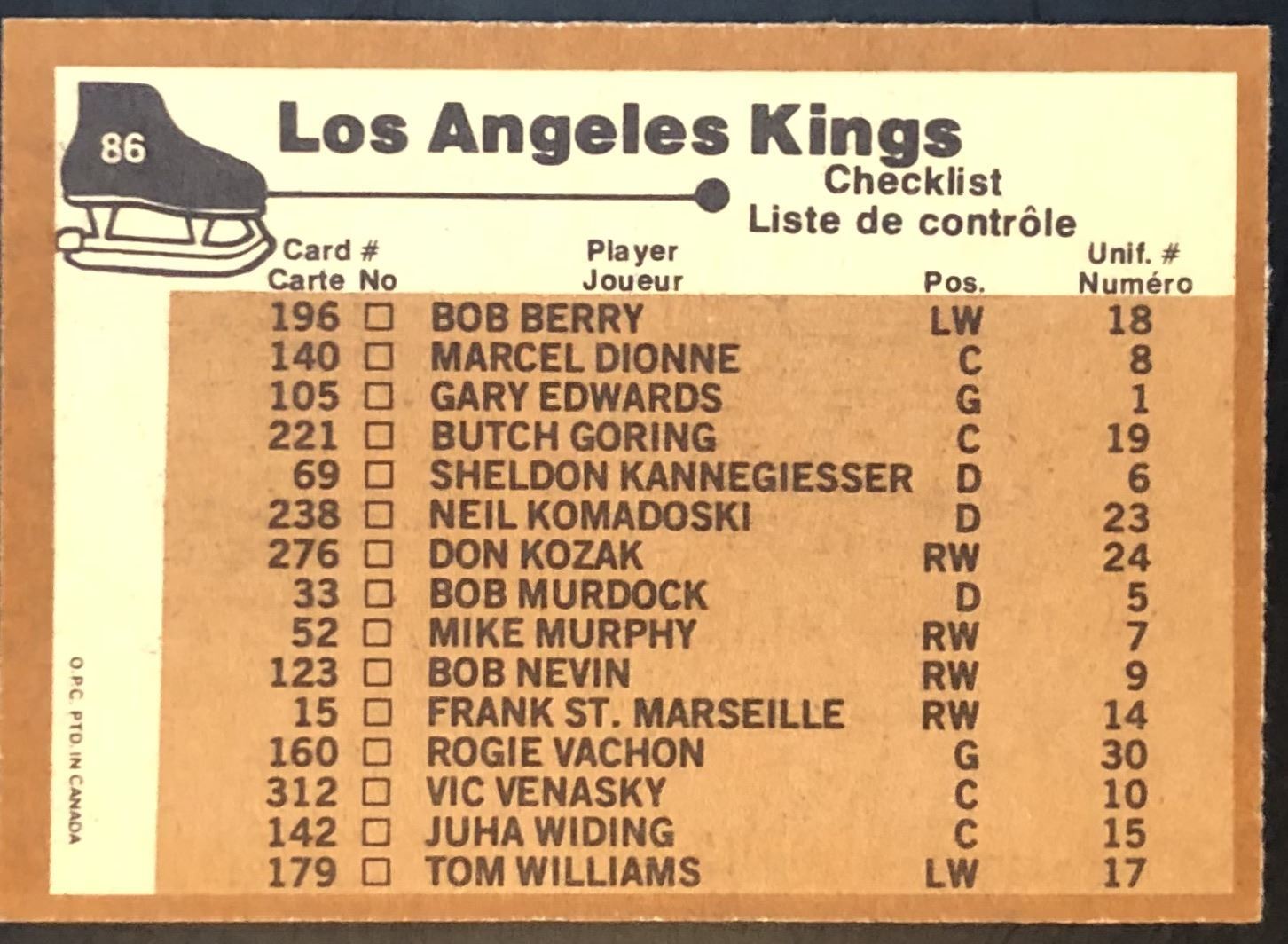 Lot 1335 1975-76 NHL O-PEE-CHEE LOS ANGELES KINGS