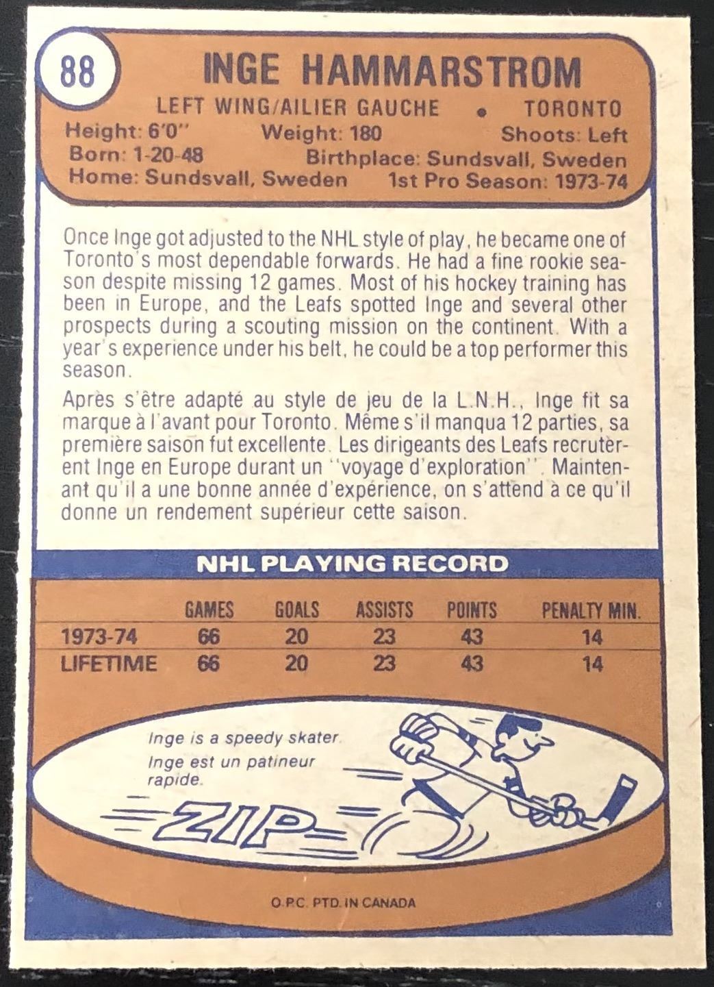 Lot 1342 1974-75 O-PEE-CHEE INGE HAMMARSTROM ROOKIE CARD