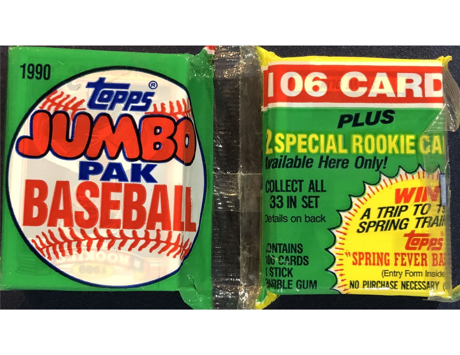 1990 TOPPS BASEBALL JUMBO CELLO PACK (106 CARDS) - KEN GRIFFEY JR. & BARRY LARKIN (HOF) SHOWING
