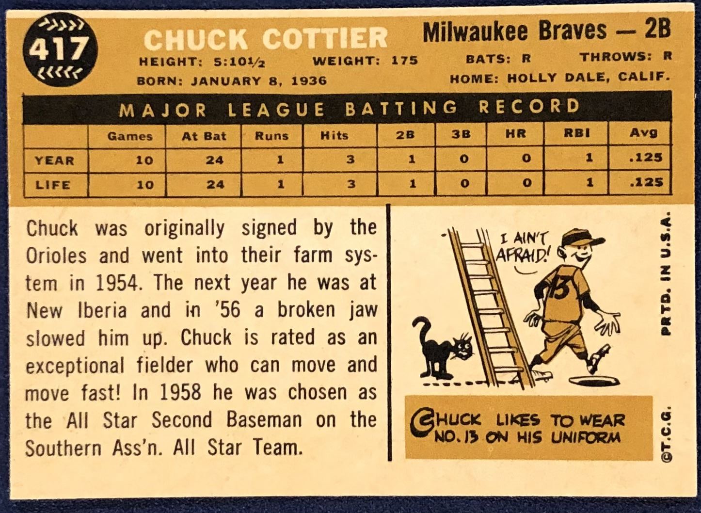 Lot 1457 1960 TOPPS BASEBALL WHITE BACKS - CHUCK COTTIER ROOKIE CARD