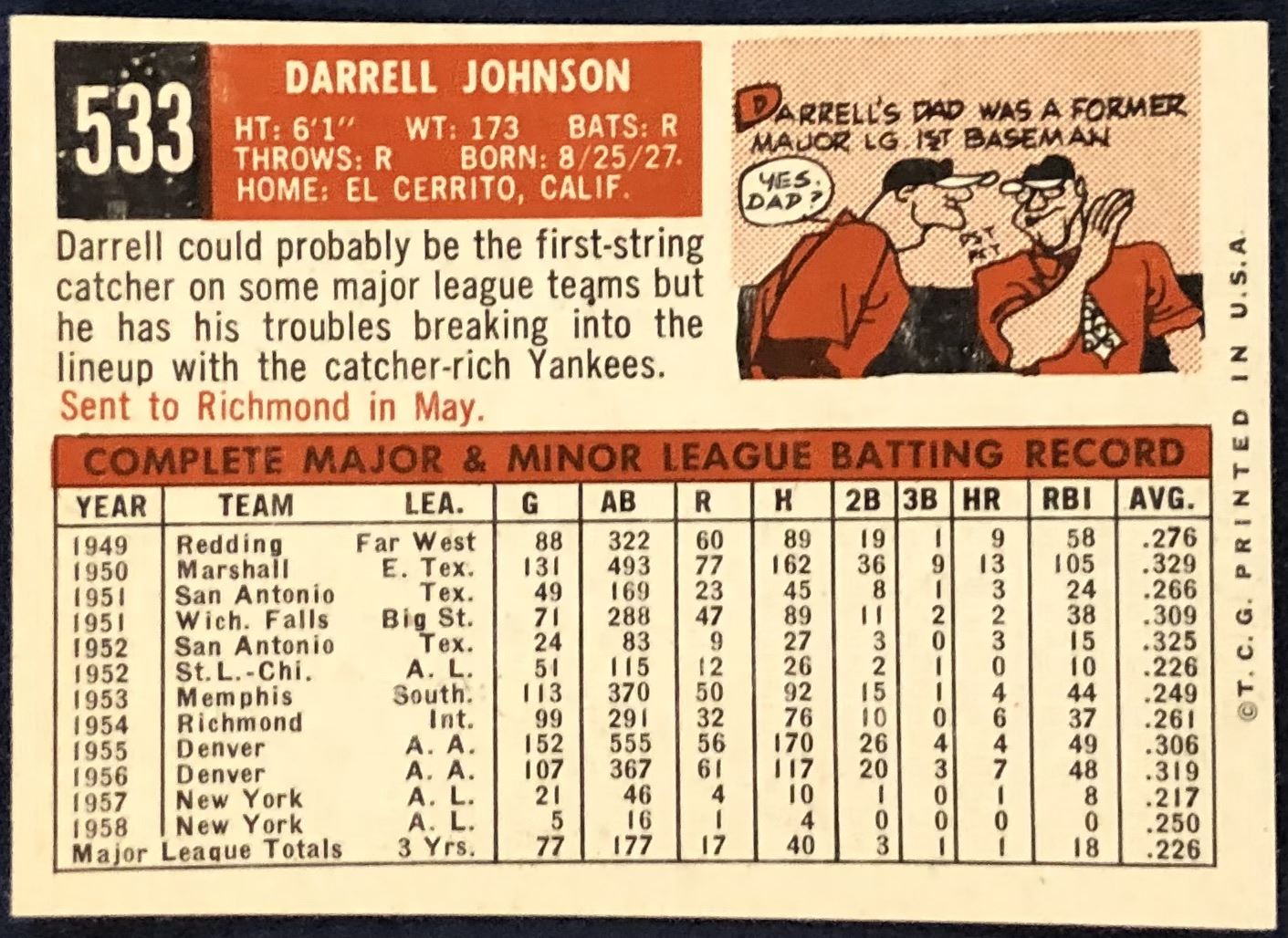 Lot 1460 1959 TOPPS WHITE BACKS HIGH NUMBERS - DARRELL JOHNSON