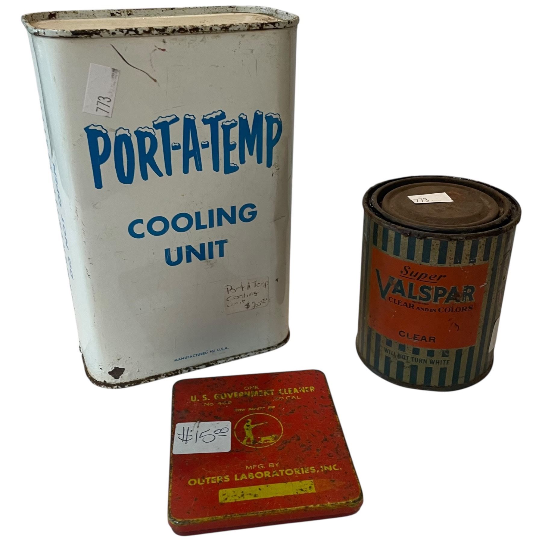 Lot 285 3 Vintage Tins * Valspar, Port-A-Temp and US Government Cleaner