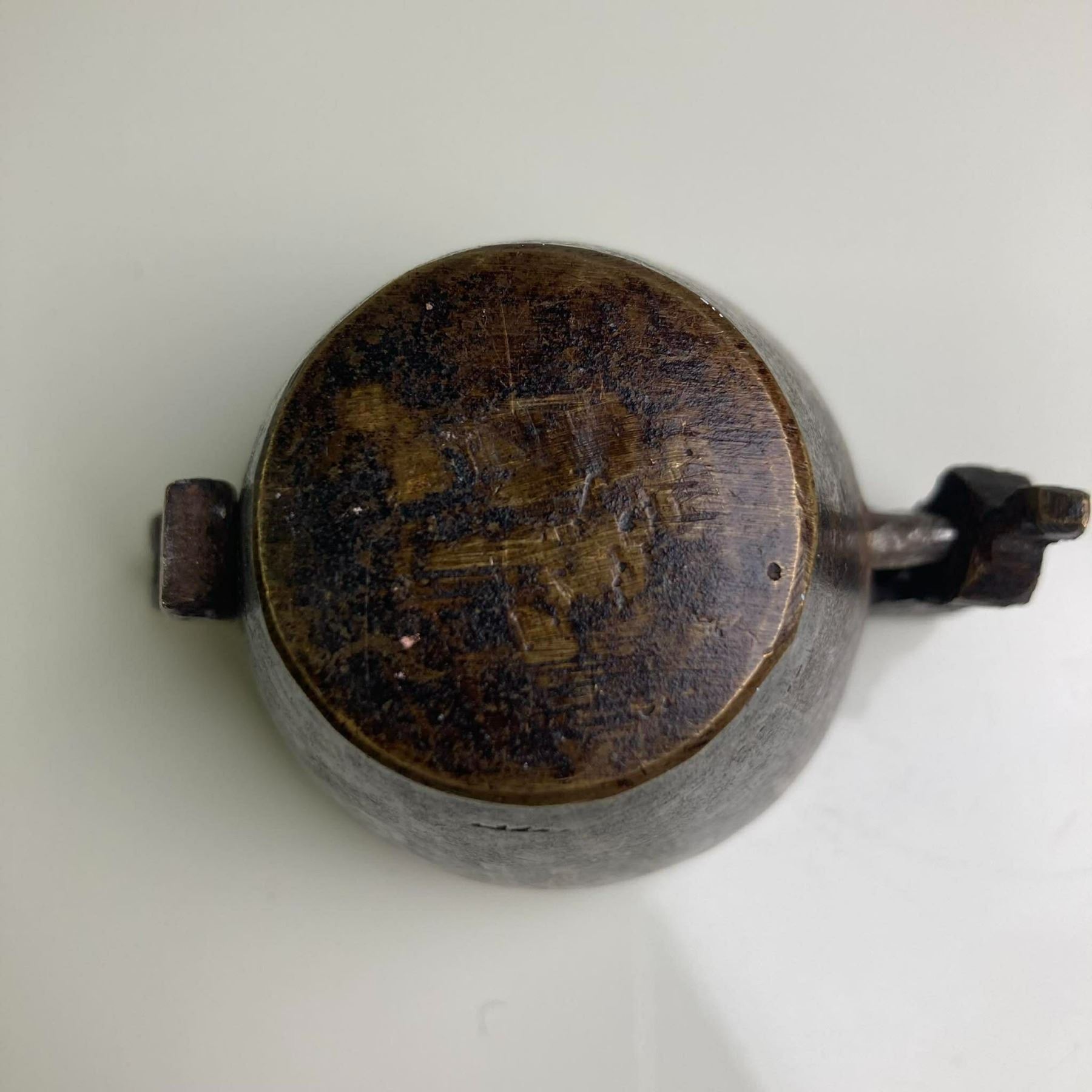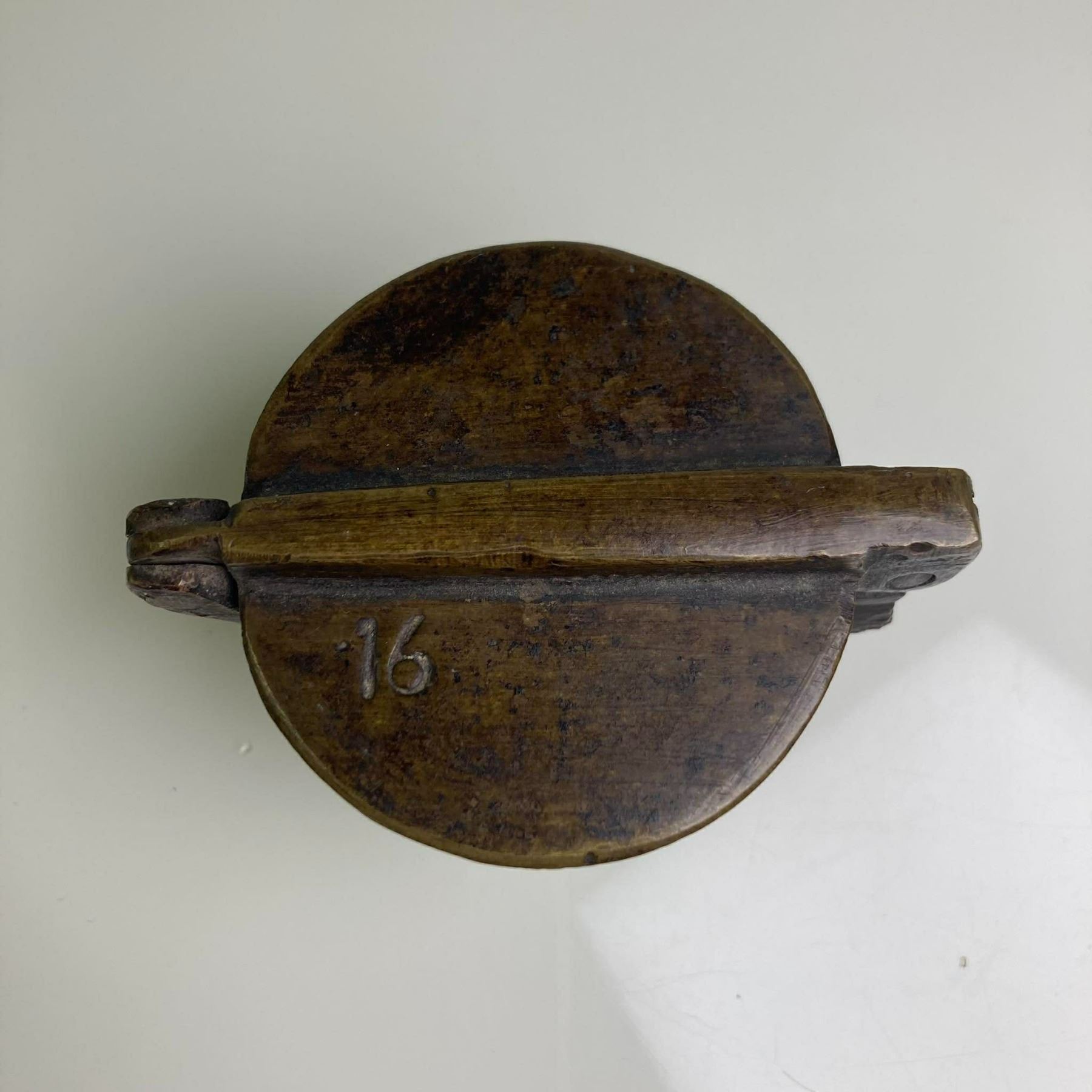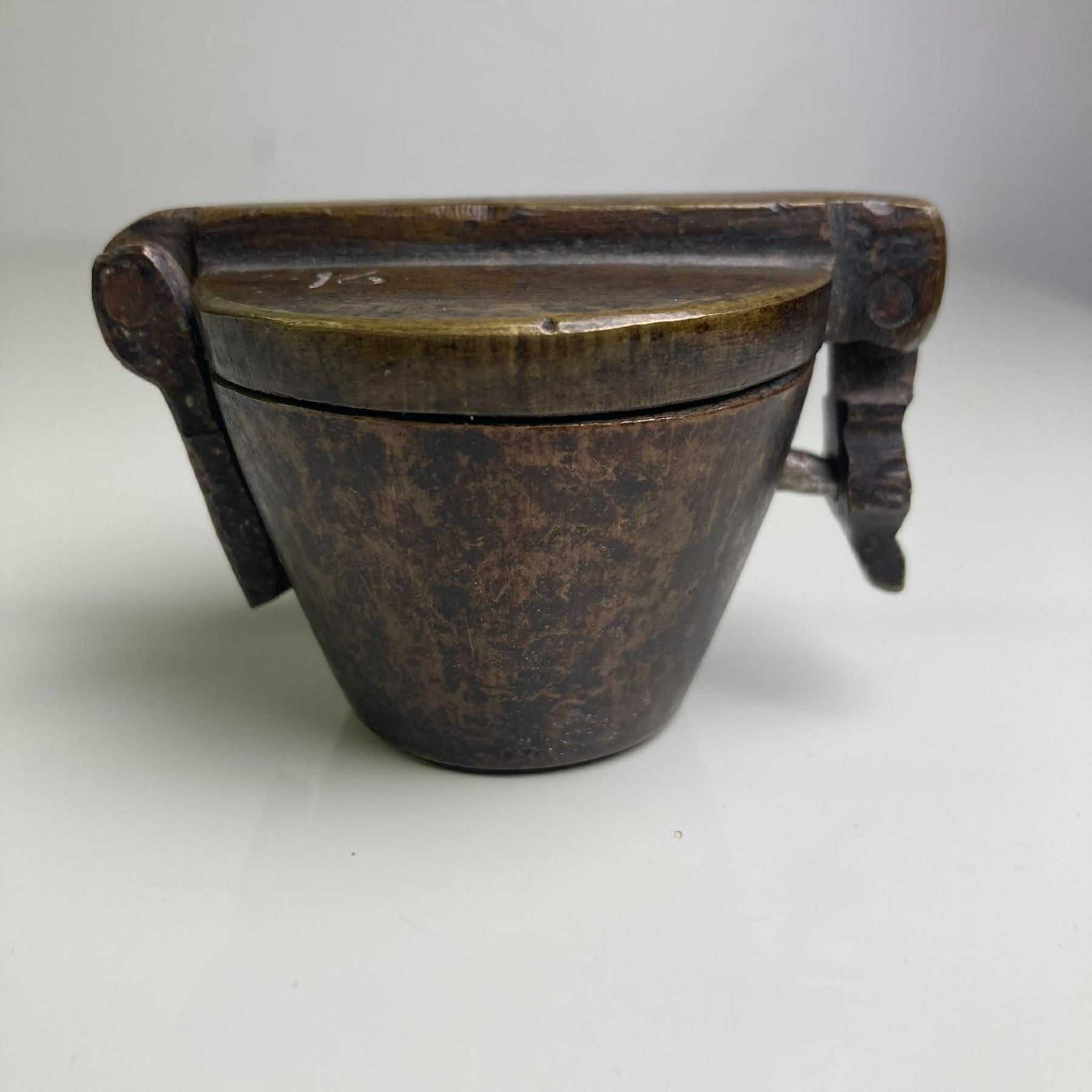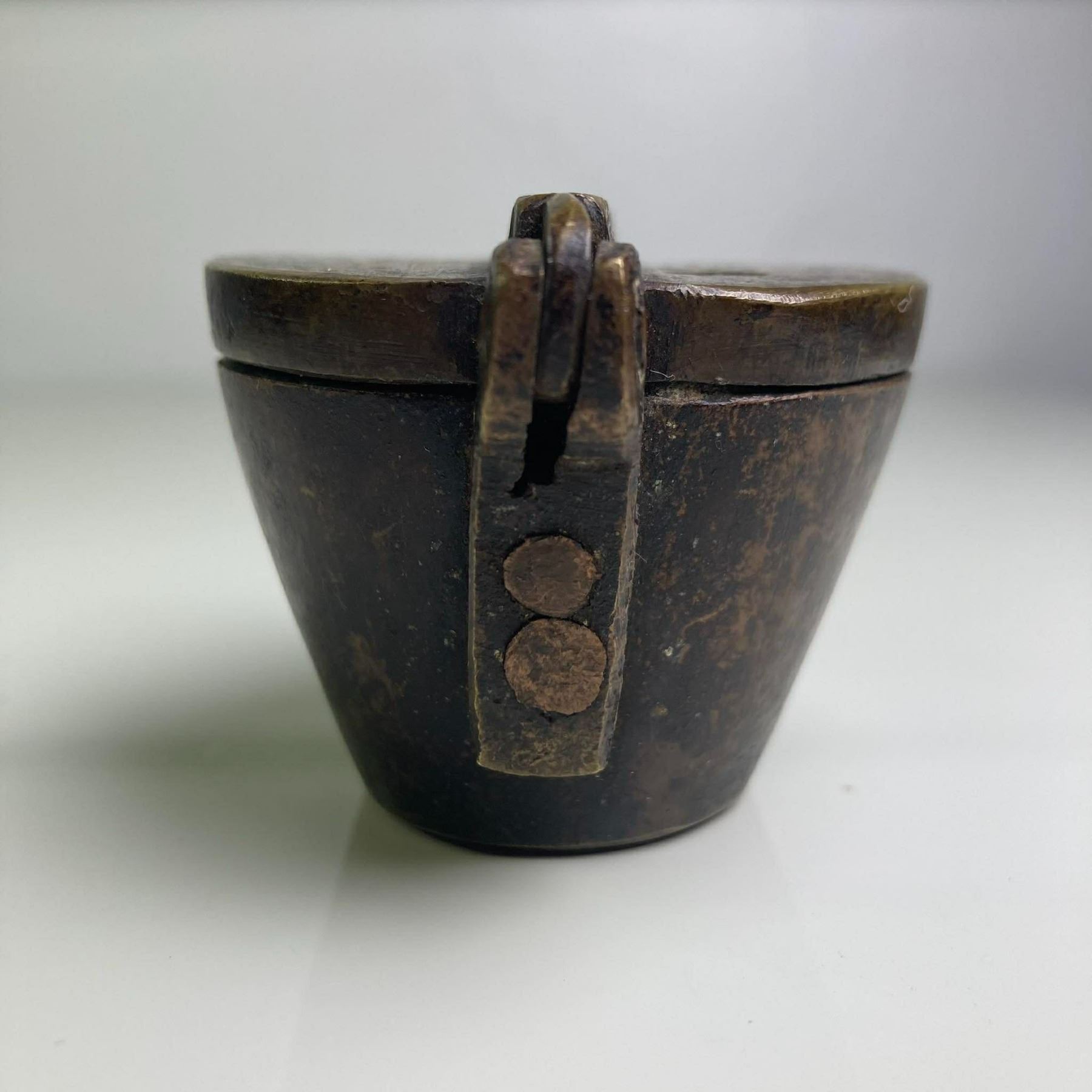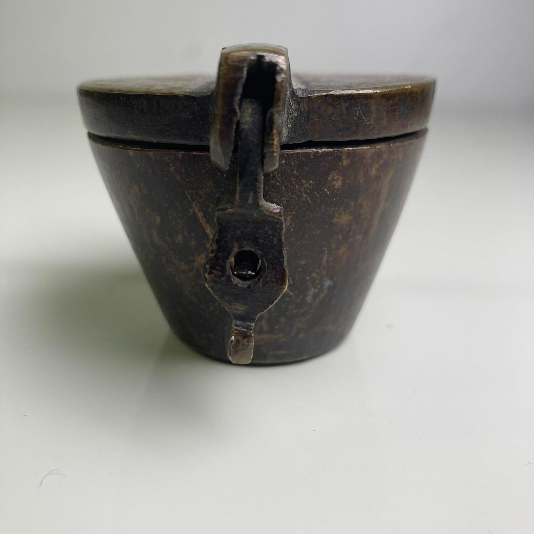Unsure of origin. Marks of 1 2 on smallest piece inside and 16 on lid. Solidly constructed. Approx. 67mm across at the top.