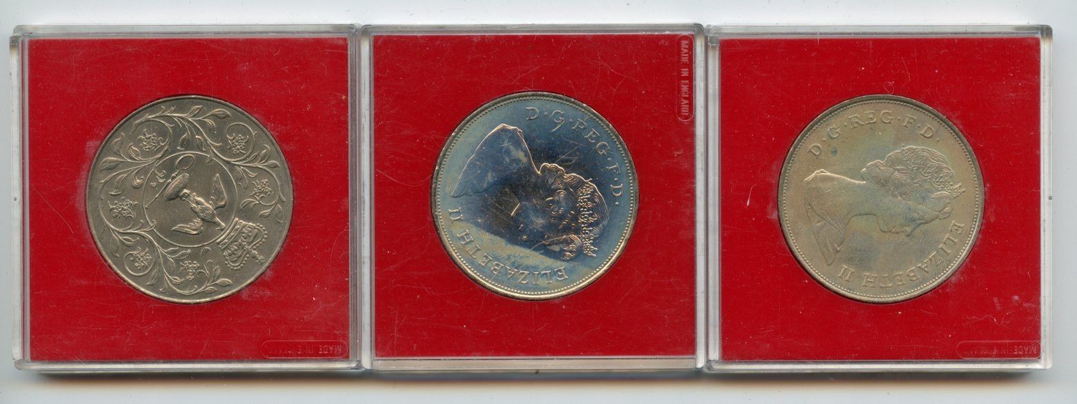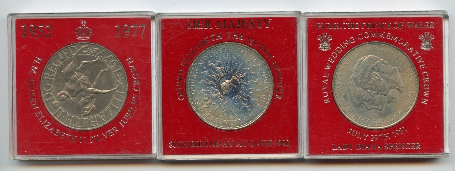 1977 Queen Elizabeth II Silver Jubilee, 1980 Queen Elizabeth the Queen Mother, 1981 Royal Wedding. 3 coins in special plastic holders.