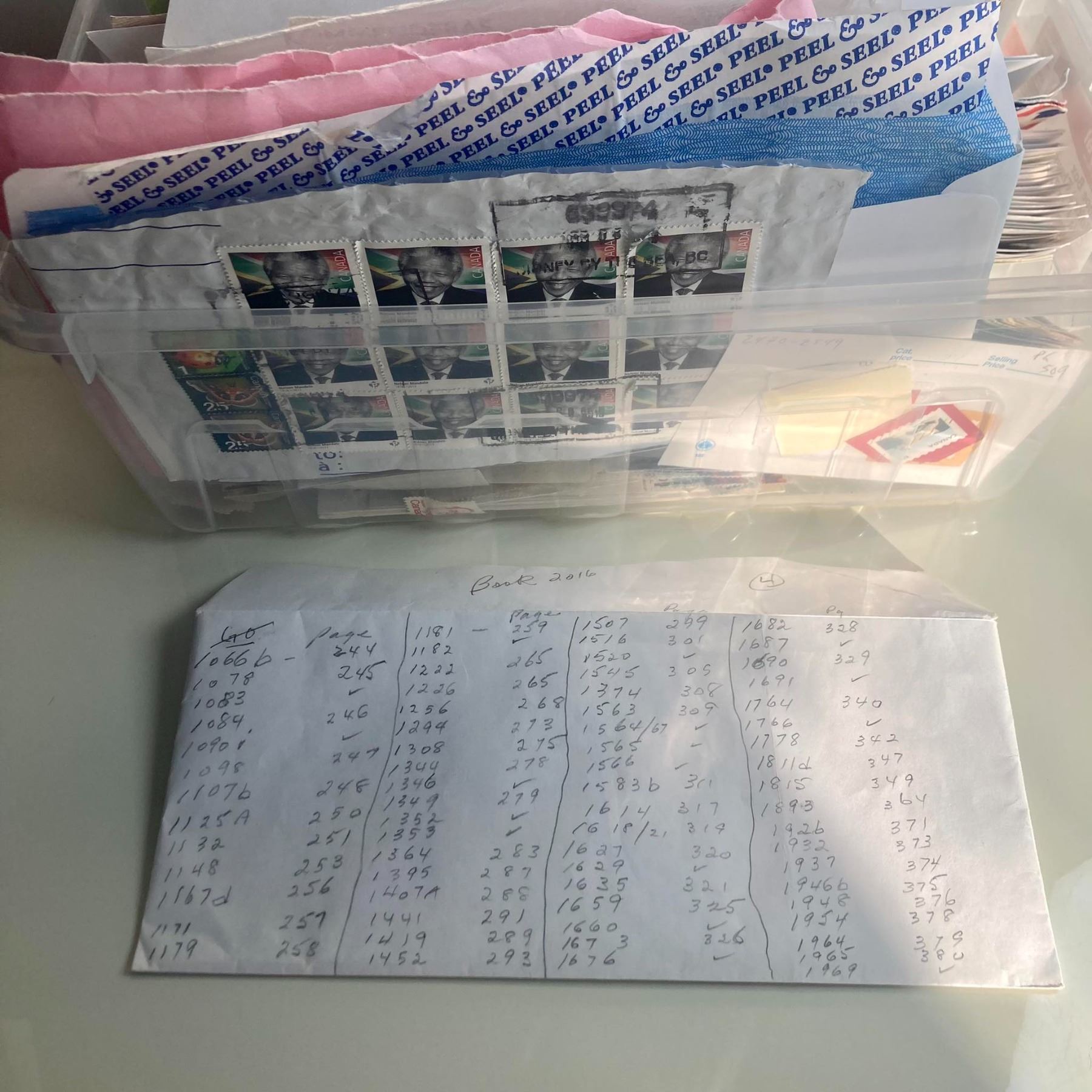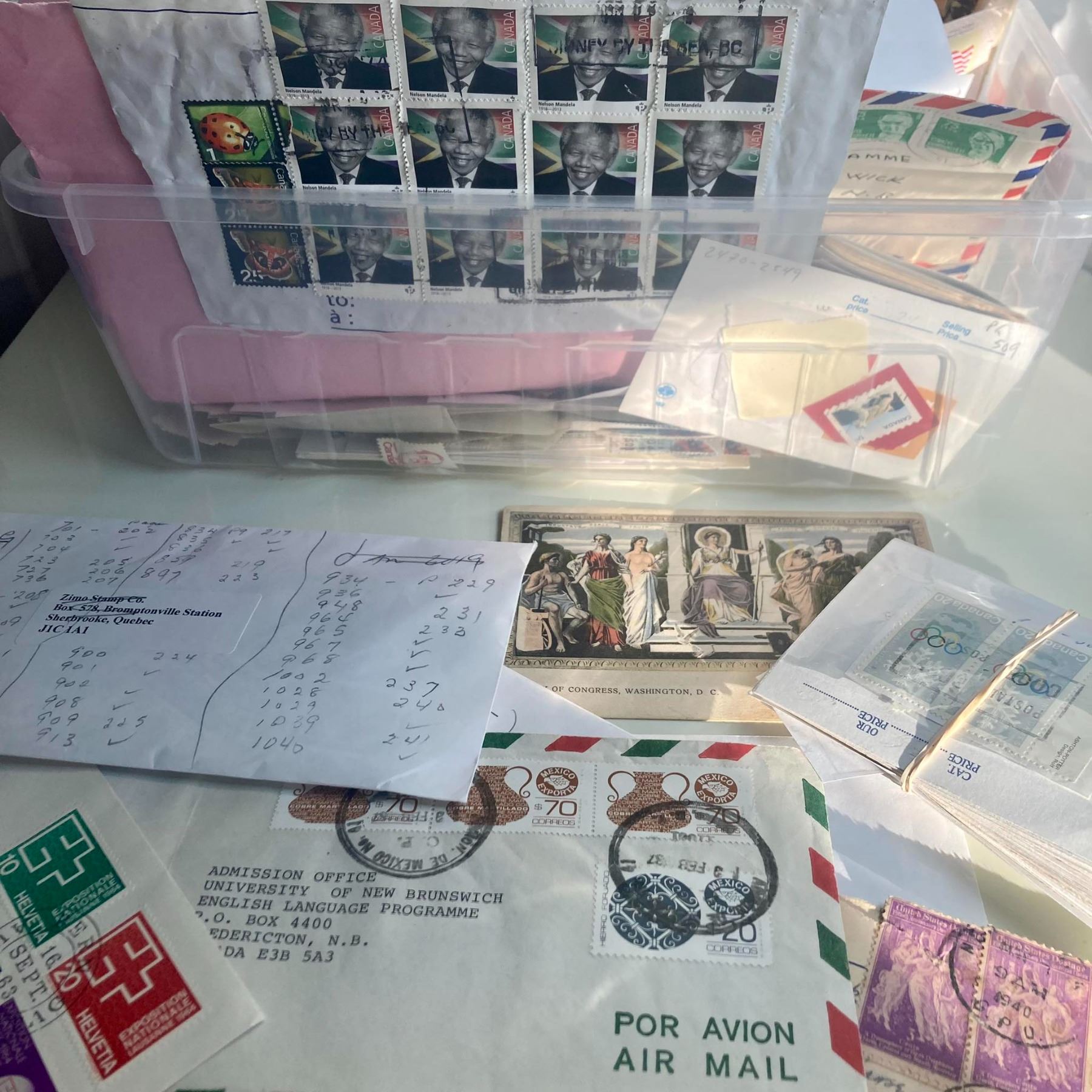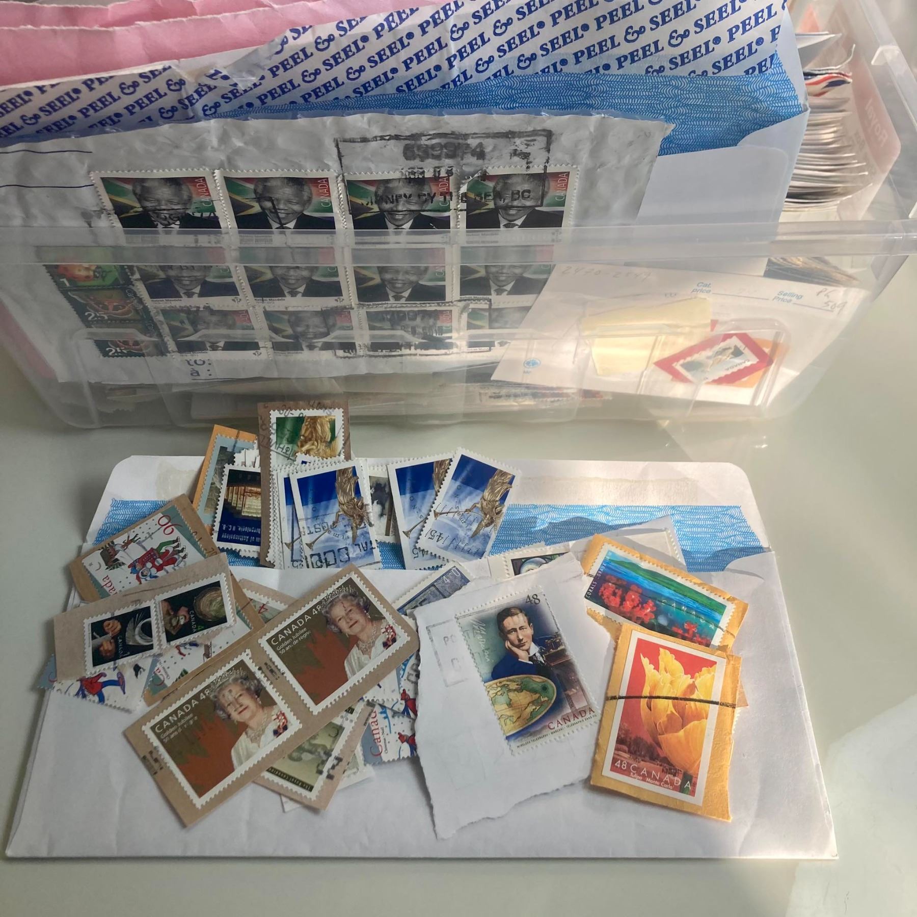 Mixed lot that includes covers and various used stamps. Mostly Canada, but there seems to be a good amount of US and world stamps too. Looks like a lot of fun for some collector.