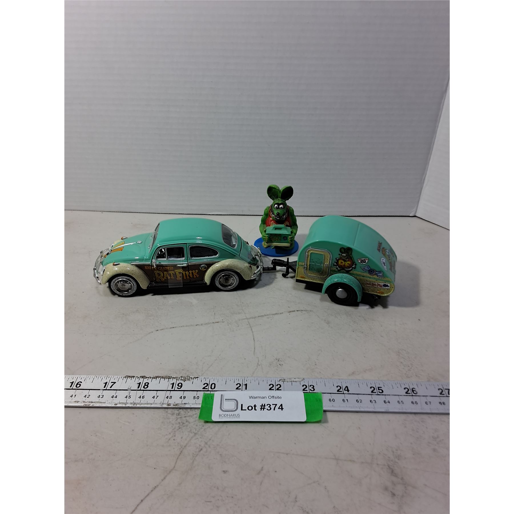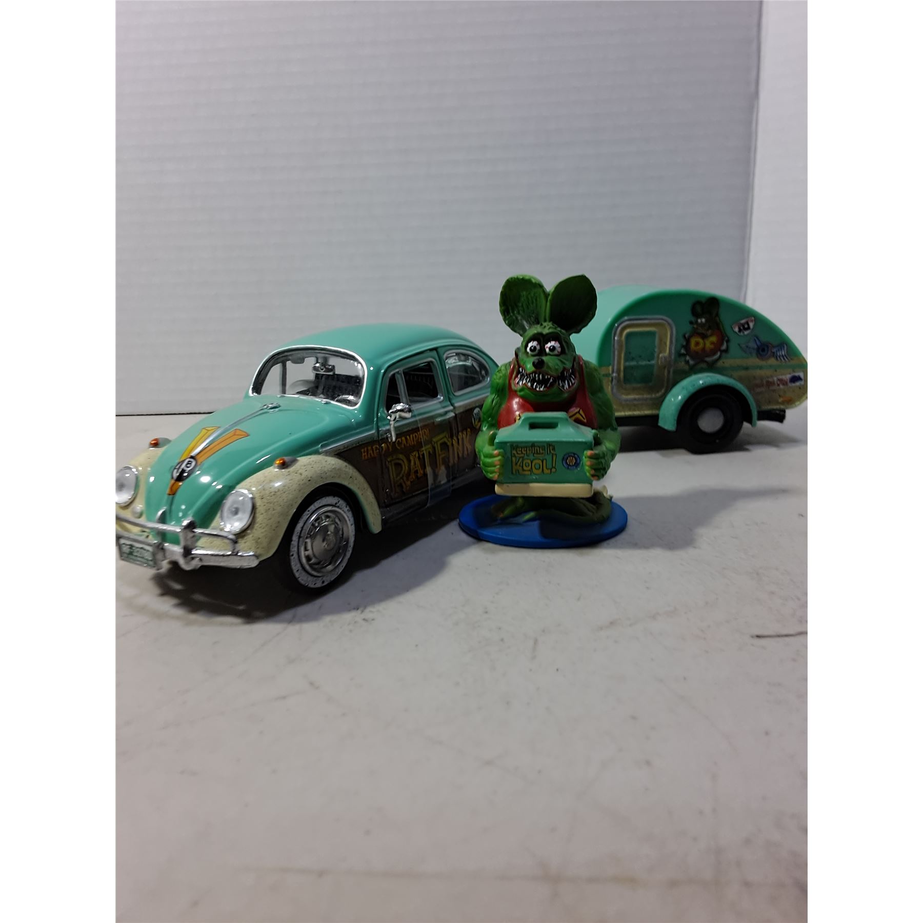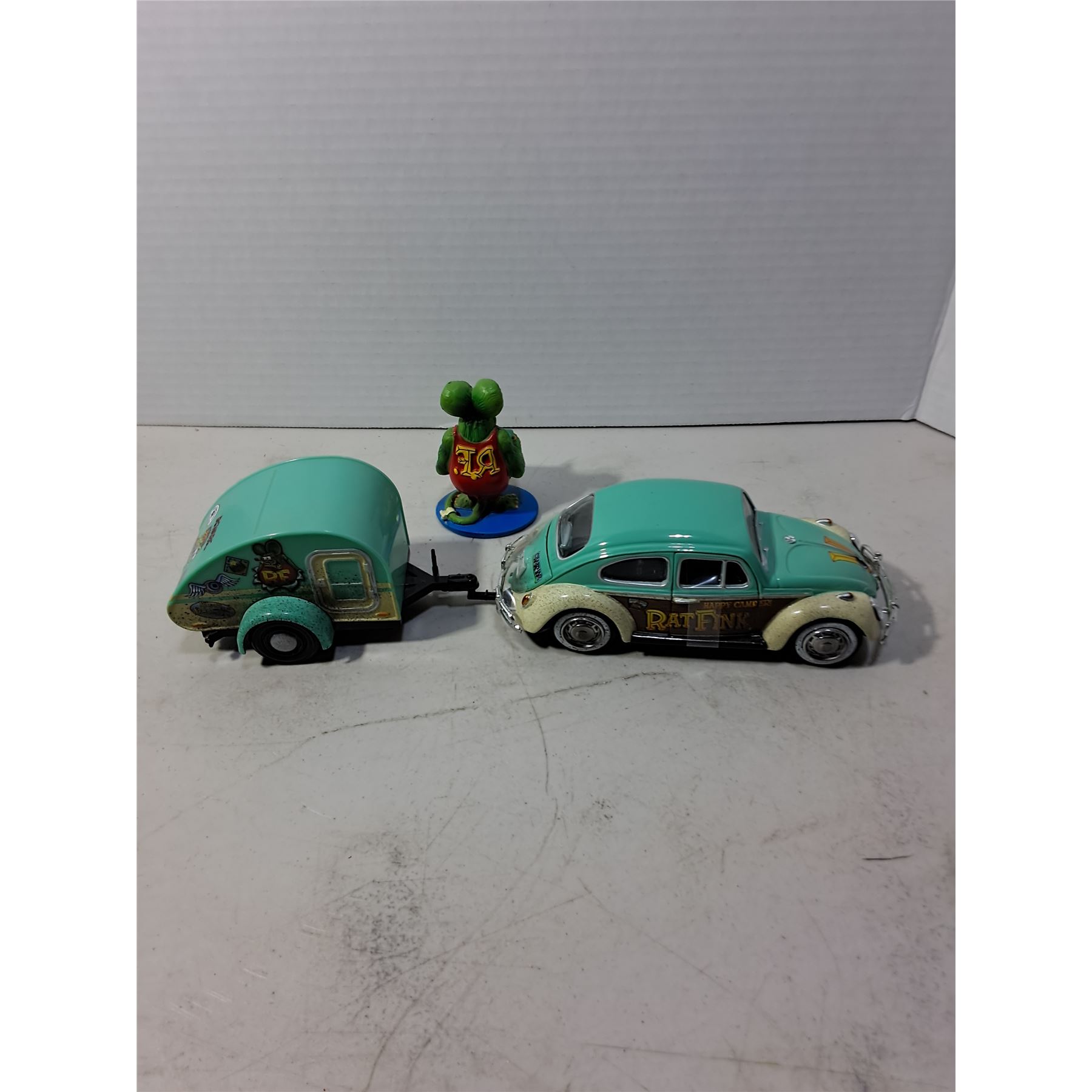 Lot 374 Rat Fink Memorabilia (VW Bug w/Sleeper Trailer & Character Ornament)