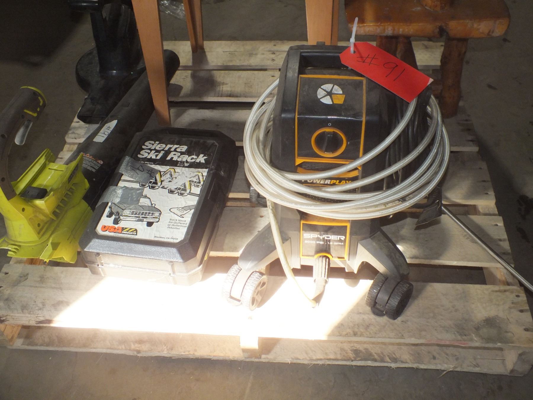 you get Spyder 2000psi pressure washer, Ryobi blower no battery or charger, ski rack, toro blower no nozzle...sold as is / where is...used