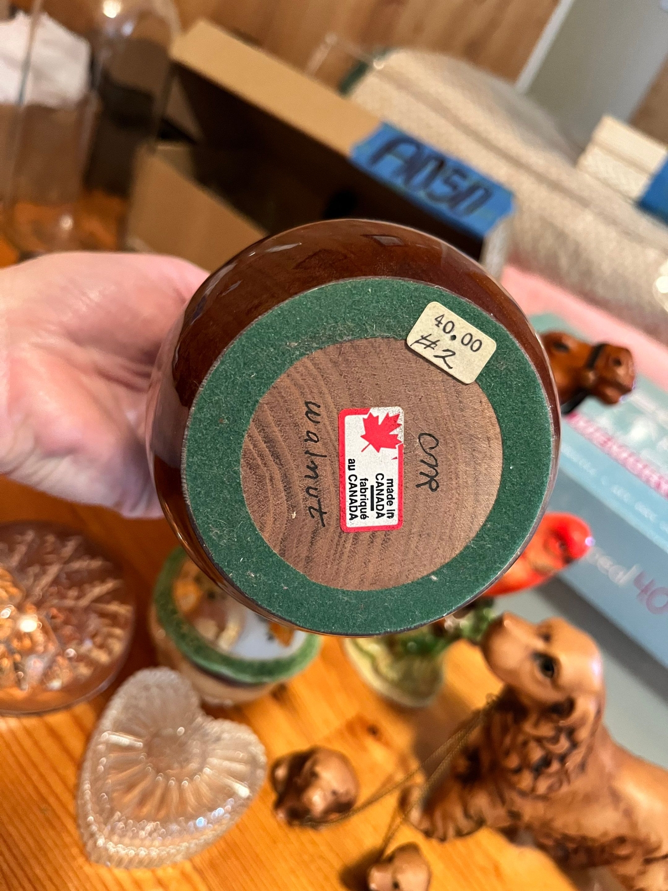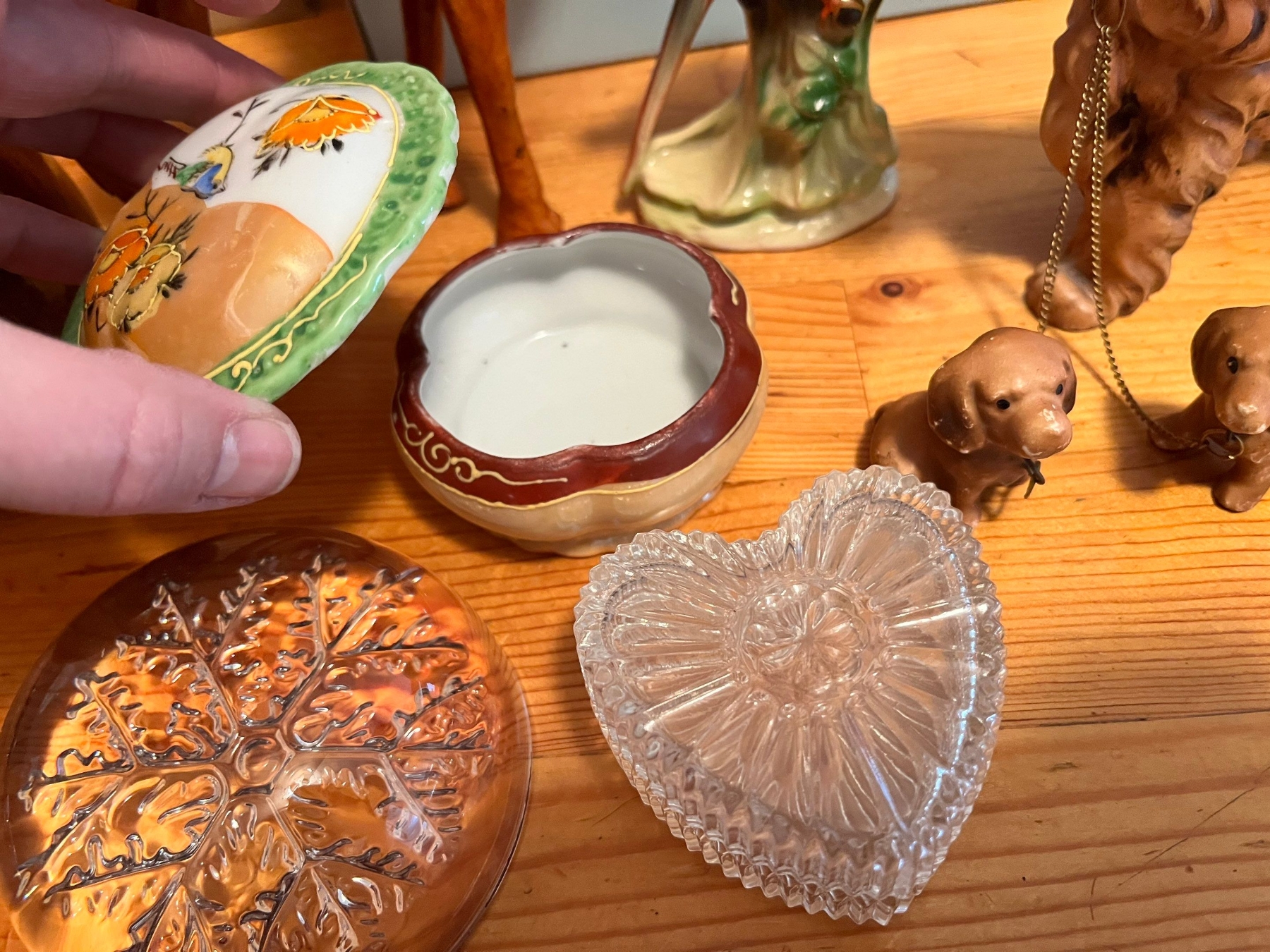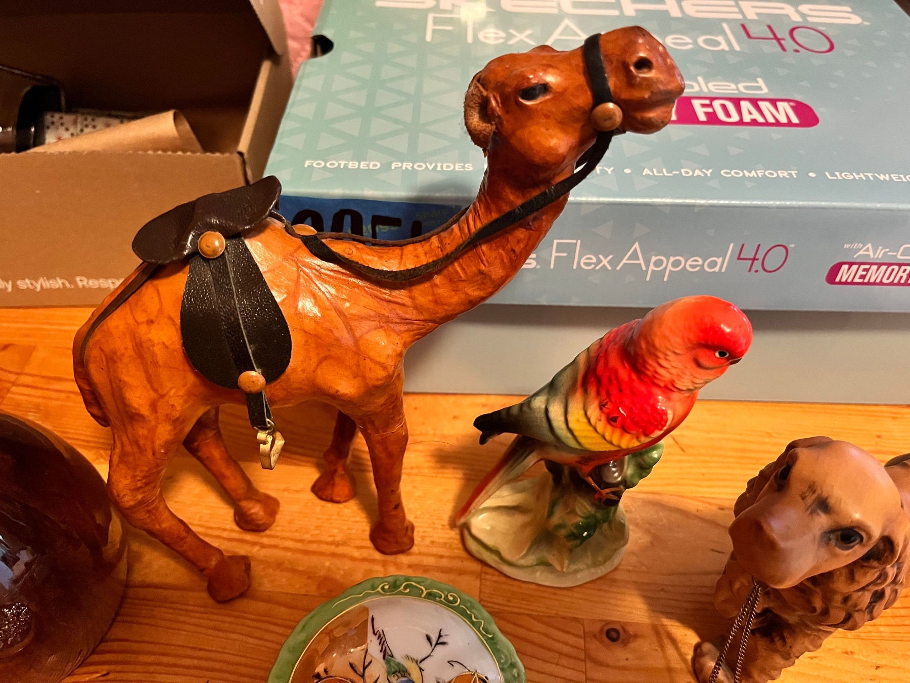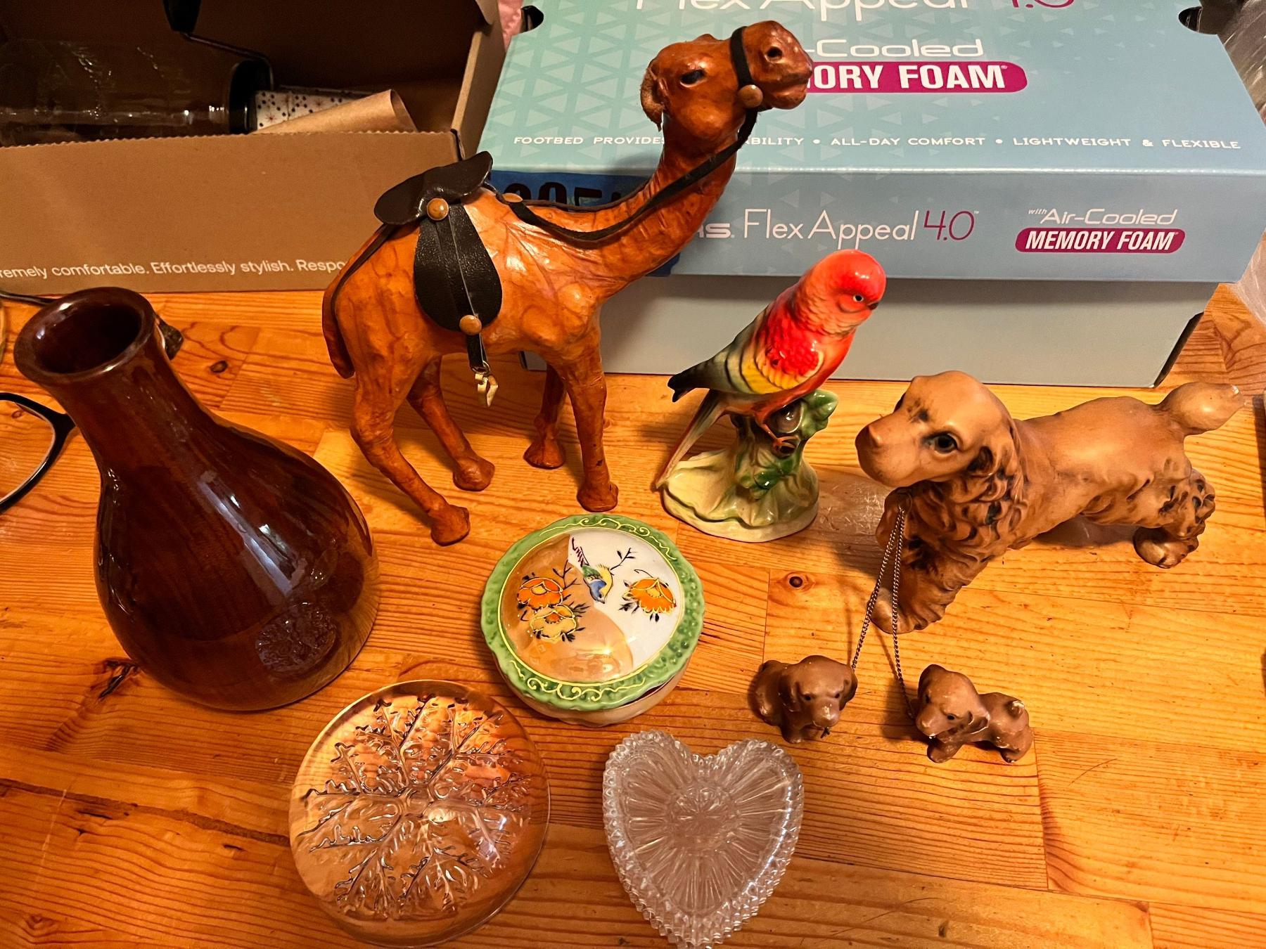 Camel made out of camel hide, vase made out of walnut, ceramic parrot and dog, 2 jewellery trinket jars, and a snowflake paper weight.