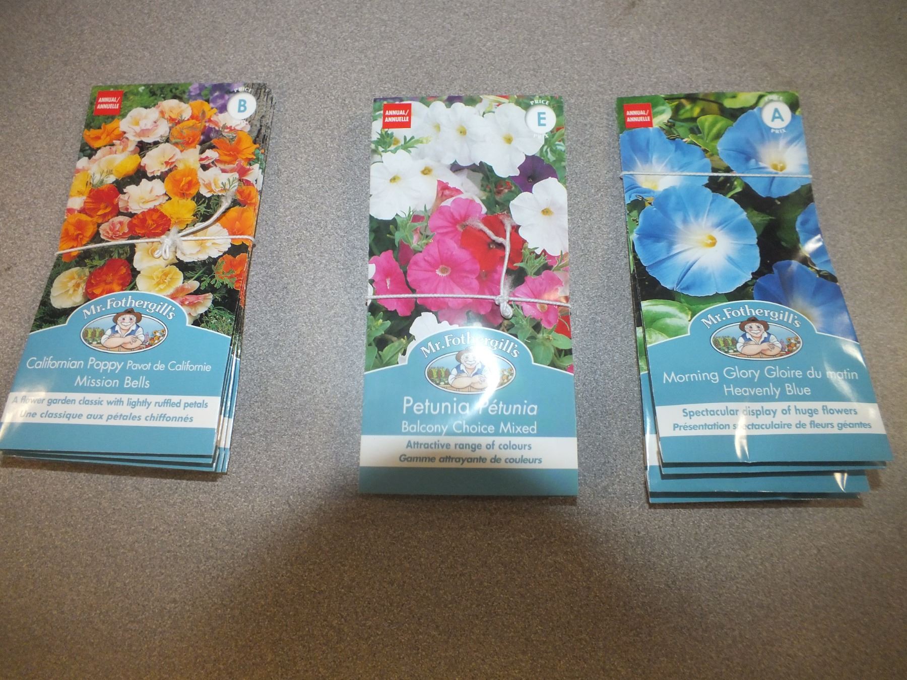 you get 15 packs in total, Californian poppy x5, Petunia x5, Morning Glory x5...sold as is / where is...new