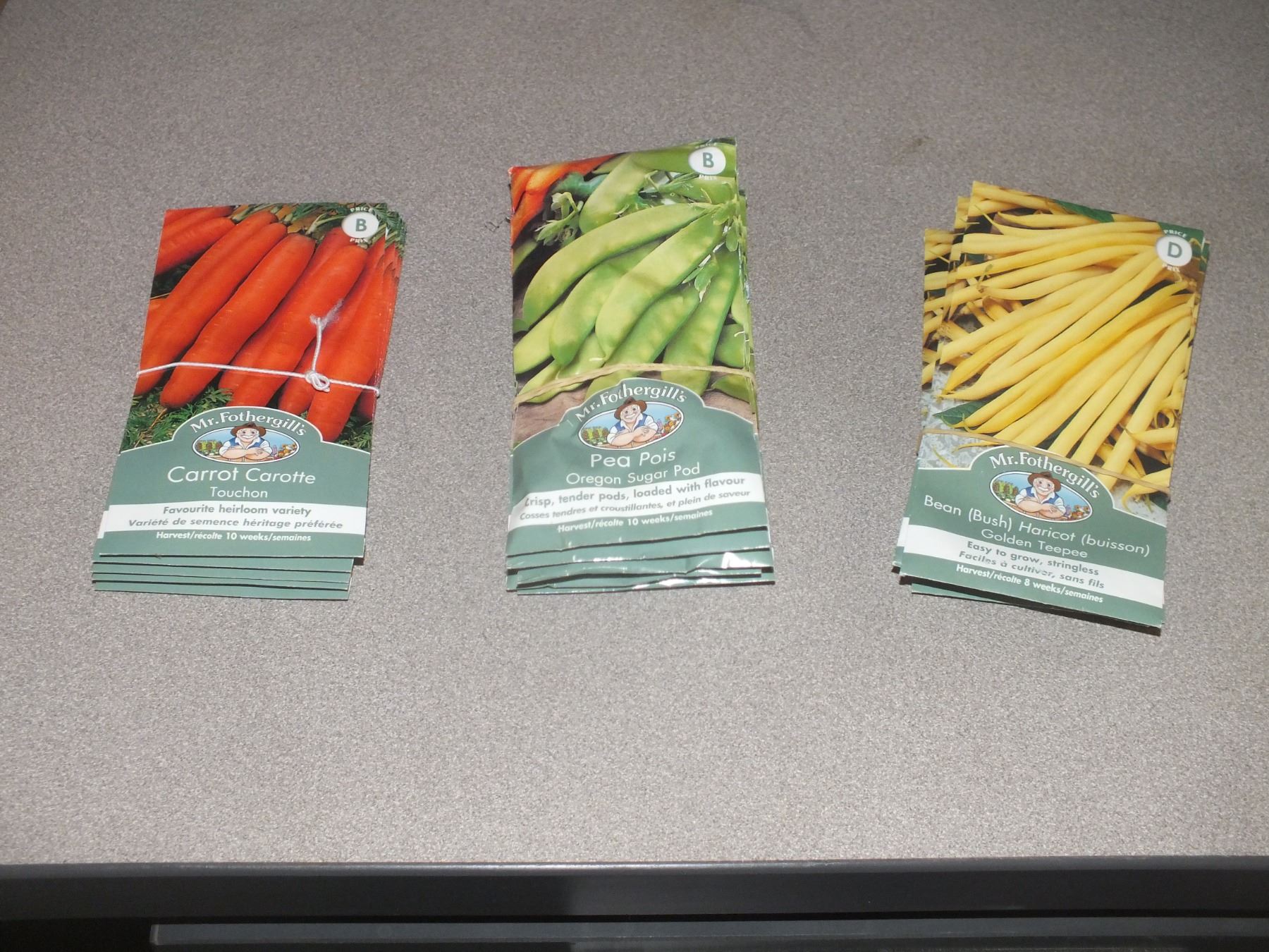 Vegetable Seed Lot, you get 15 packs in total, carrots x5, pea Oregon sugar pod x5, golden teepee hair cut beans x5...sold as is / where is...new
