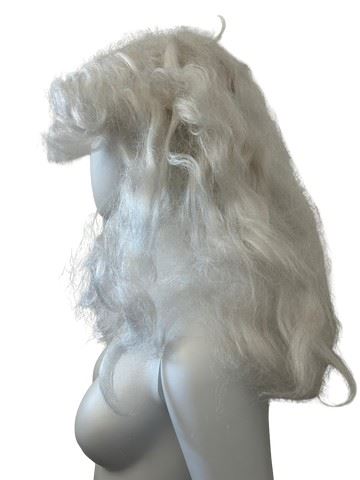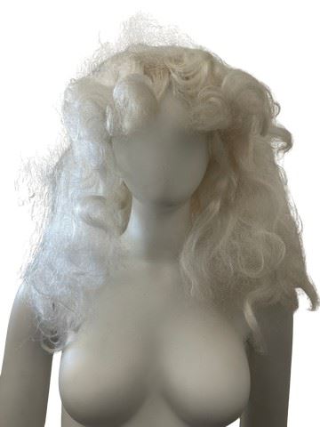 Custom made 18th century style white, long haired, wavy with curly bangs wig from the film Mirror Mirror starring Julia Roberts and Lily Collins. The film is known for its elaborate fantasy costumes designed by Eiko Ishioka. Worn by a background character in the Queen's ballroom scenes. Made by Westbay.
