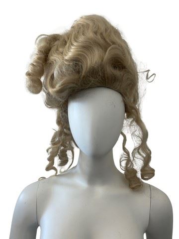 Marie Antionette/18th century style blonde wig, custom made for the film Mirror Mirror starring Julia Roberts and Lily Collins. The film is known for its elaborate fantasy costumes designed by Eiko Ishioka. Used on a background character in the Queen's ballroom scenes. Made by MonaLisa Collection. #81 Marie-Helene character is noted on a piece of tape on the inside. Wig contains several bobby pins to hold it together. Made by MonaLisa Collection.