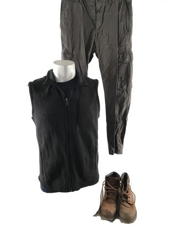 Stan Hurley (Michael Keaton) screen worn, hero, charcoal black sleeveless zipper up the front 'Patagonia' vest, (size S) blue crew neck cut off sleeves 'Boss' shirt, (size S) mint green chino/fatigue "Adeen Summer" trousers, (size 30/30) and an Timberland style lace up the front boots.