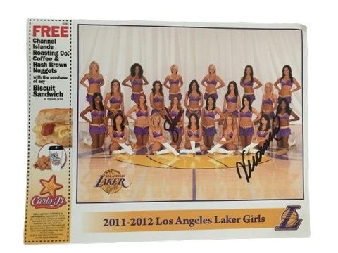 2011 to 2012 Los Angeles Laker Girls promotional photo with a Carl’s Jr. coupon attached. Signed by two of the Laker girls who autographed next to their photo. 8.5”x11”.