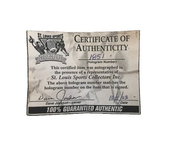Includes COA from St Louis Sports Collectors Inc and hologram sticker 1851, dated 10/5/03. Displayed in clear acrylic case.