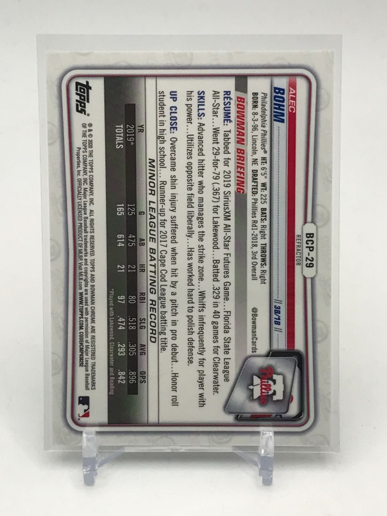 Lot 67 2020 TOPPS BOWMAN CHROME ALEC BOHM BASEBALL TRADING CARD 414/499