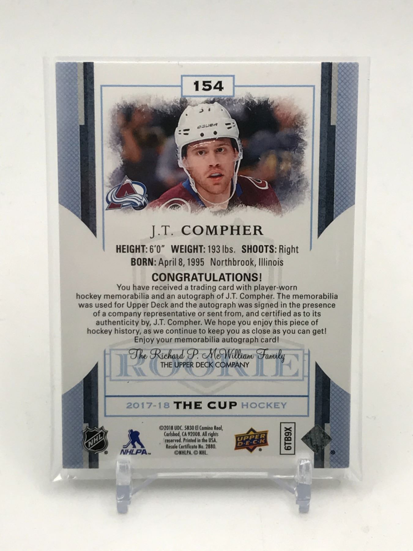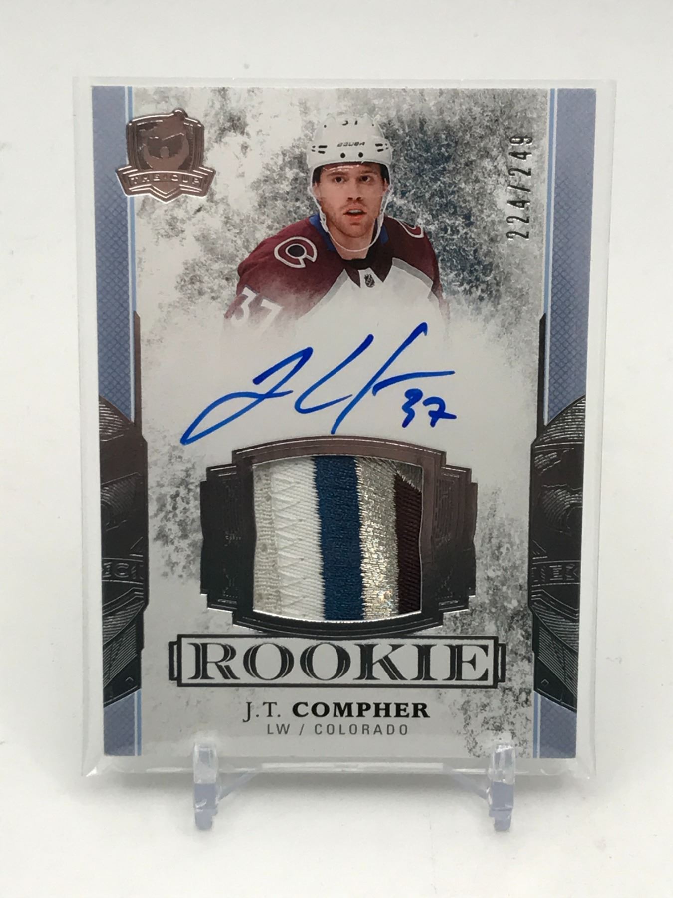 Lot 176 2017-18 UPPER DECK THE CUP HOCKEY J.T COMPHER SIGNED PATCH ROOKIE TRADING CARD 224/249