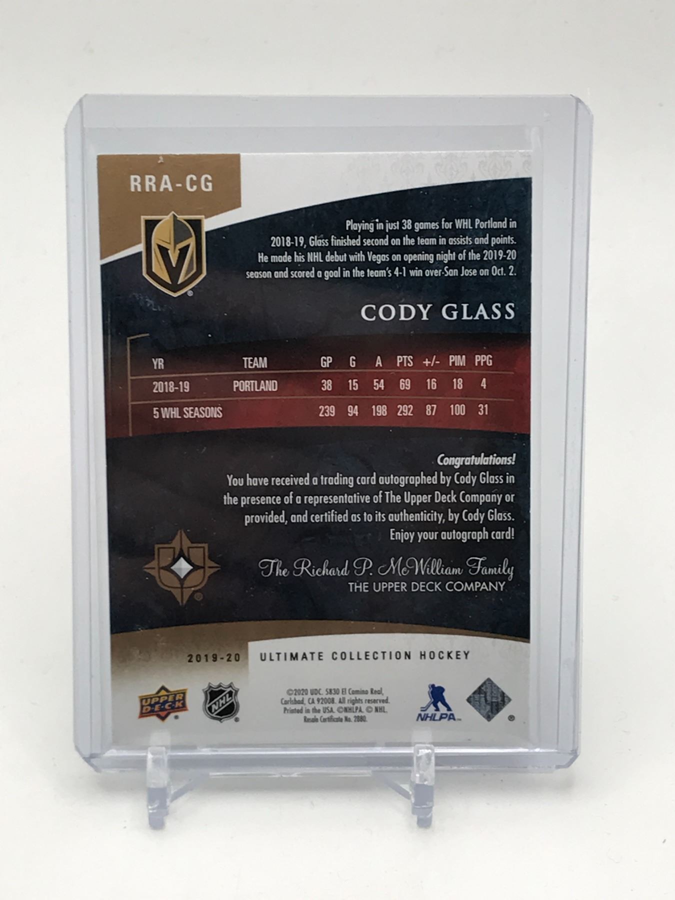 Lot 201 2019-20 UPPER DECK ULTIMATE COLLECTION HOCKEY CODY GLASS SIGNED TRADING CARD 054/125