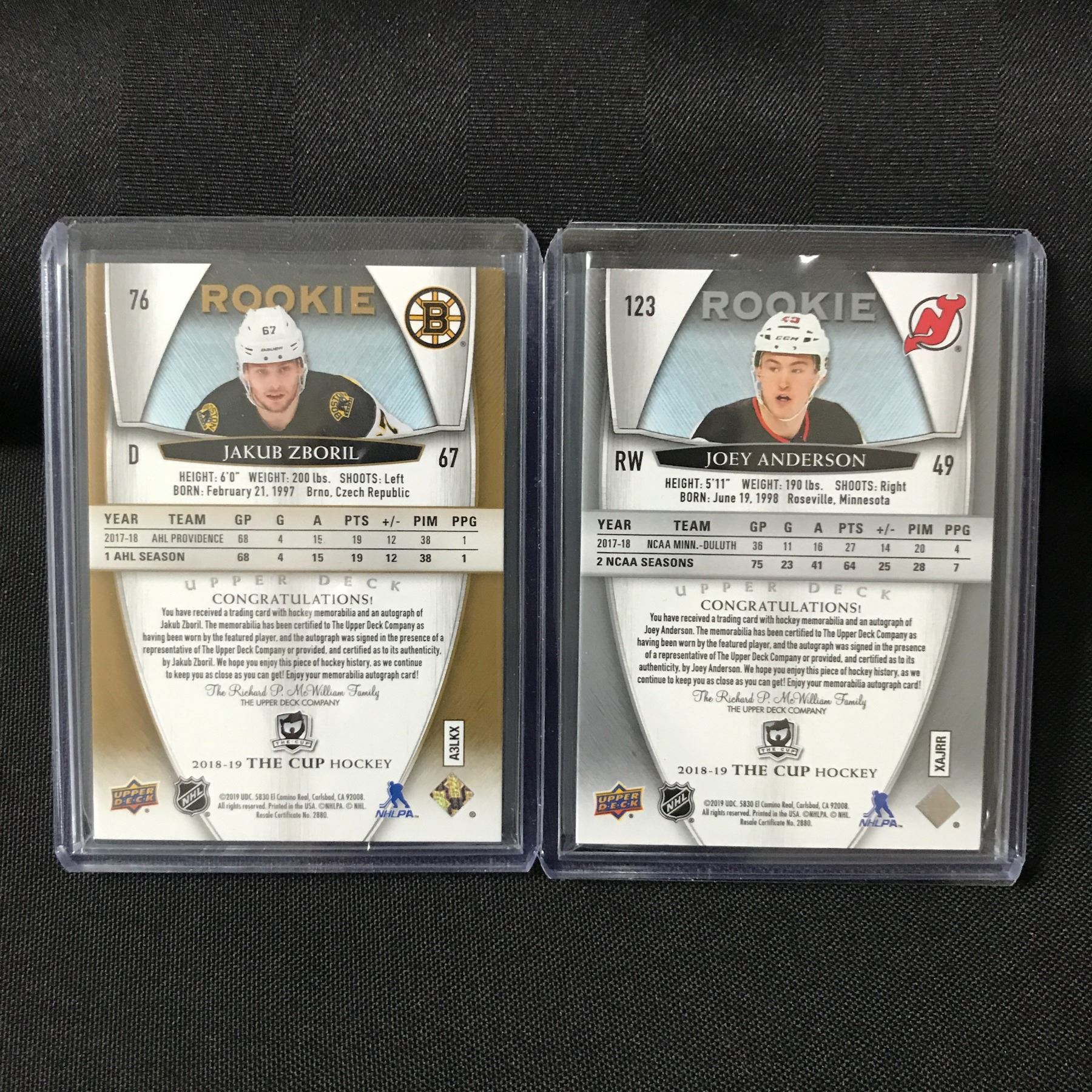 Lot 224 LOT OF 2 UPPER DECK 2018-19 UPPER DECK CUP HOCKEY SIGNED ROOKIE PATCH TRADING CARDS -06/24 & 011/249