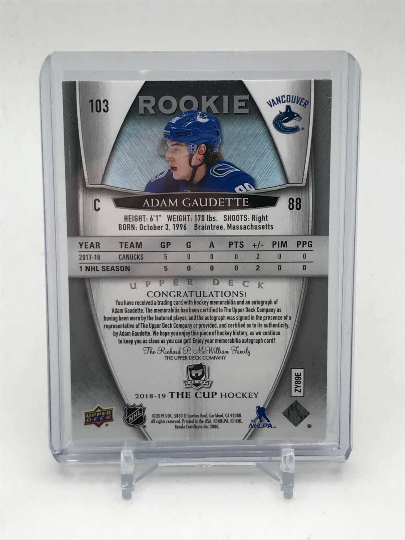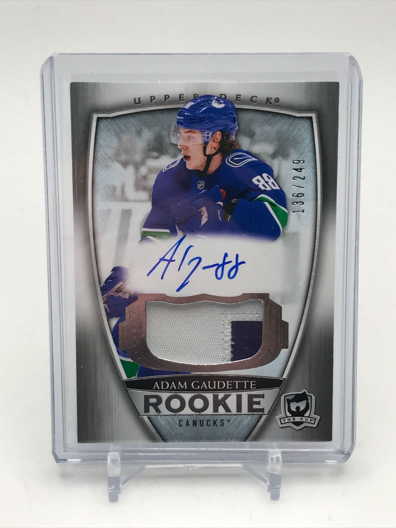 Lot 264 2018-19 UPPER DECK THE CUP HOCKEY ADAM GAUUDETTE SIGNED ROOKIE PATCH TRADING CARD 136/249