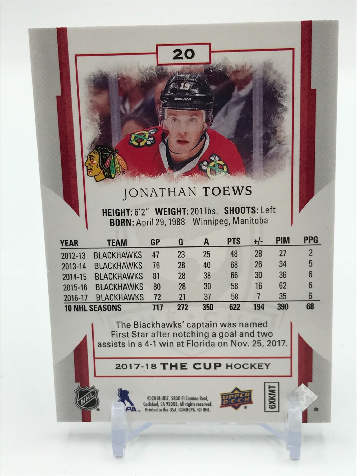 Lot 351 2017-18 UPPER DECK THE CUP HOCKEY JONATHAN TOEWS TRADING CARD - 039/249